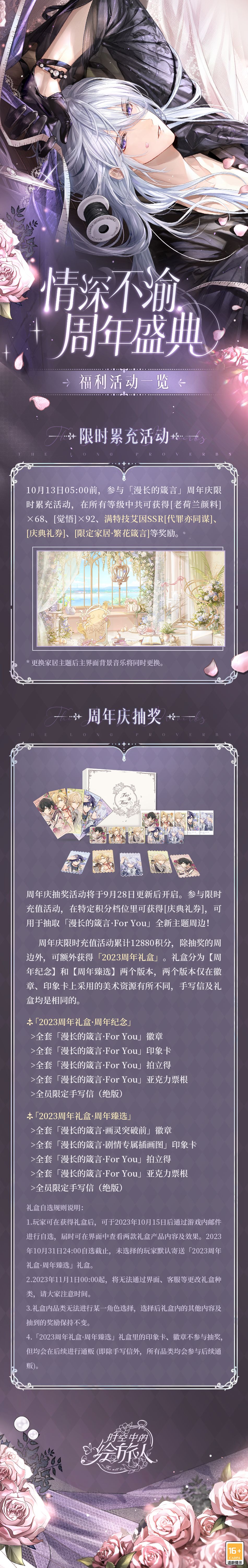 ★参与限时充值活动,在特定积分档位里可获得[庆典礼券],用于抽取「漫长的箴言·For You」全新主题周边。累计12880积分,可获得「2023周年礼盒」,周年礼盒分为「2023周年礼盒·周年纪念」礼盒版本和「2023周年礼盒·周年臻选」礼盒版本,具体可点击下方图2查看。