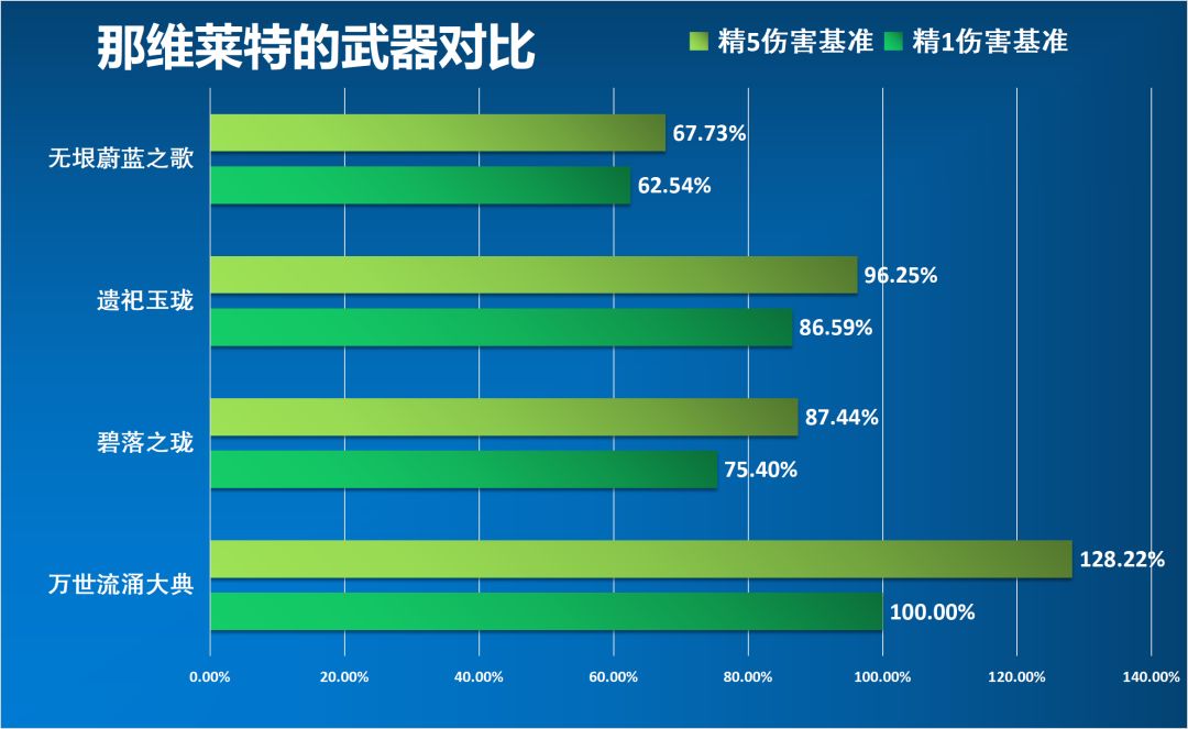 图片解析:以【精1】的伤害为基准100%,【精5】为1%,则说明【精5】相对于【精1】伤害提高1%,其他武器同理。有的武器没算精1和精5的伤害,说明该武器精1和精5的伤害一样。(想要知道不同武器的伤害差距或精炼差距,可根据上图自行对比。)