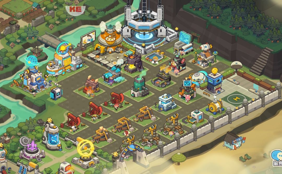 为了更好的视觉效果,用好友探访视角截的图。我把需要每天操作的建筑都放这里了,点击更方便,还剩一个右上角的农场每天再点击种菜。每一竖行是一种原材料相应的加工建筑,上面单独三个是最初的原材料加工厂,现阶段需要加工的最多,单独摆放,建筑之间有间隔方便点击操作,同时容易看到每个建筑时候都有人物入驻享受加成。
