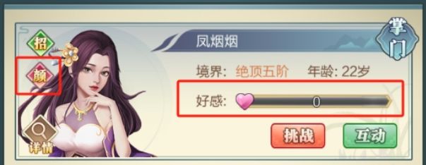 然后需要进行挑战和互动将该NPC的好感度提升到100,触发解锁红颜的门派任务。