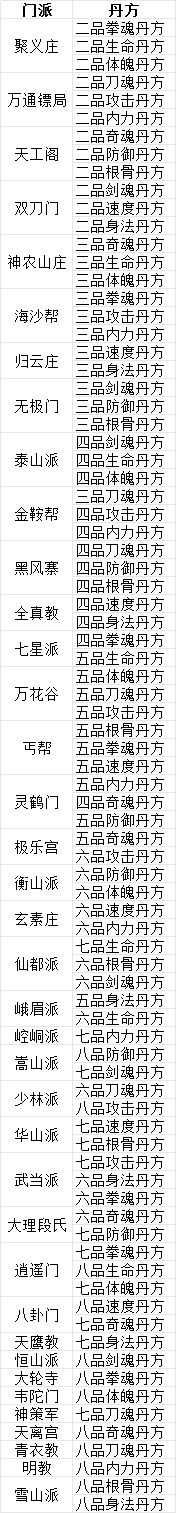 以下是门派丹方列表,请各位大侠查漏补缺!