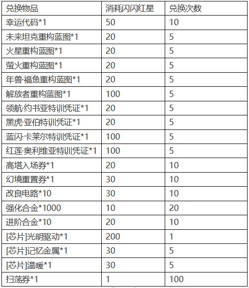 活动内容:活动期间,通过作战任务、和平行动、安全驾驶、商店购买等活动获取活动道具“闪闪红星”,消耗“闪闪红星”兑换奖励。