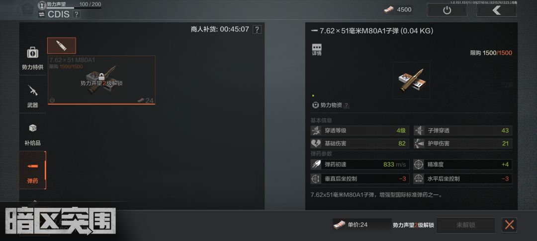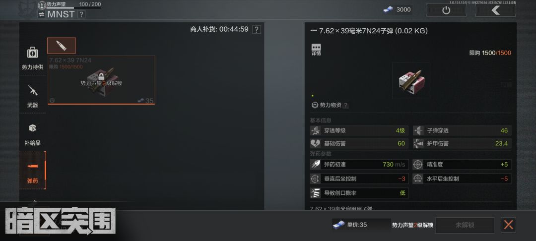 再说回这个赛季。这次的势力物资非常良心,特维拉和黑金的联络人给的都是四级弹,分别是7.62×39 7N24和7.62×51M80A1(意为改进版)。其数值都比市场上的四级弹数值要高。