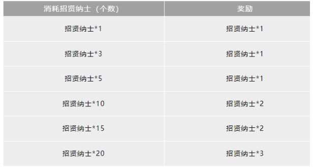 活动期间,累计消耗一定数值的「招贤纳士」将可以获得对应数量的「招贤纳士」。