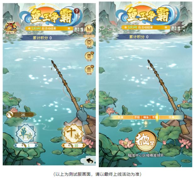 1.玩法:掌门购买鱼竿即可参与游戏,根据掌门抛竿、收竿的精准度来算出本次钓鱼积分,积分越高,钓得珍稀鱼类概率越高,对应兑换道具越多。