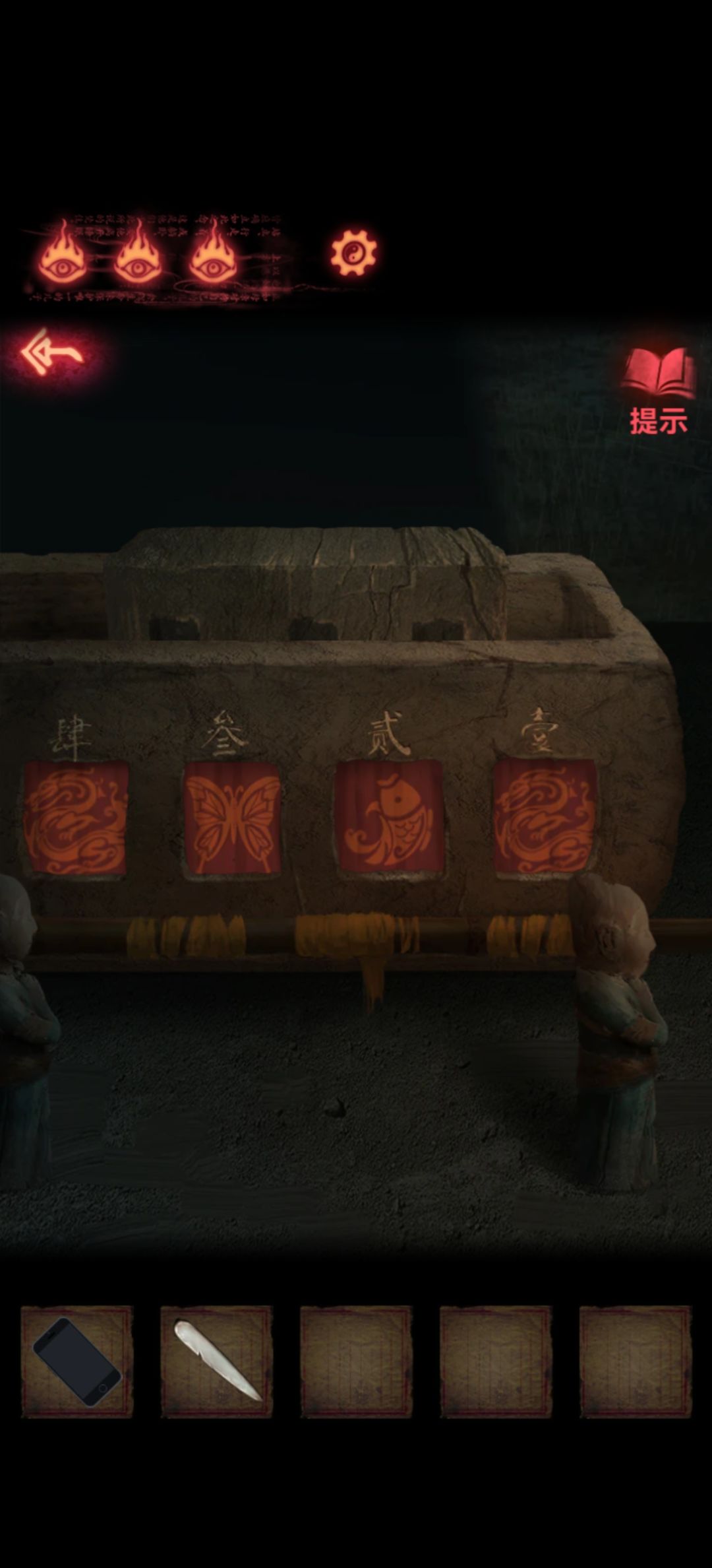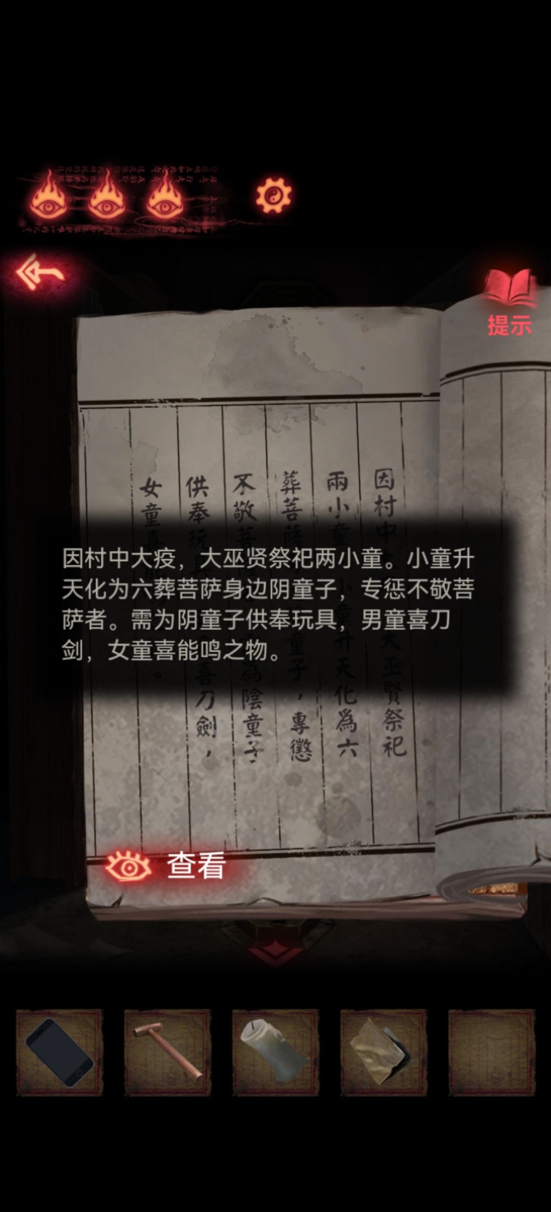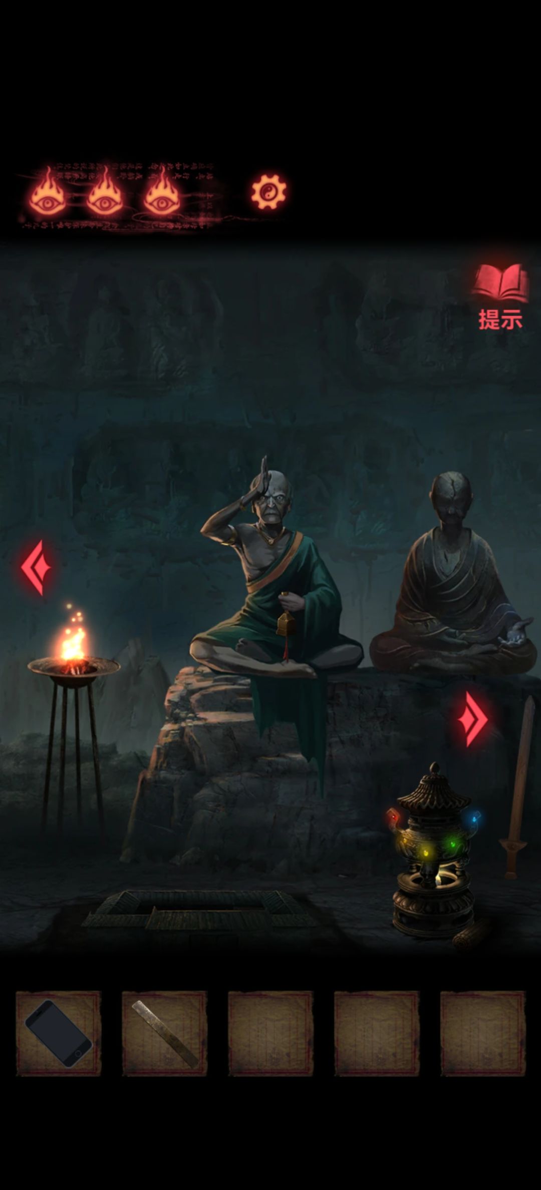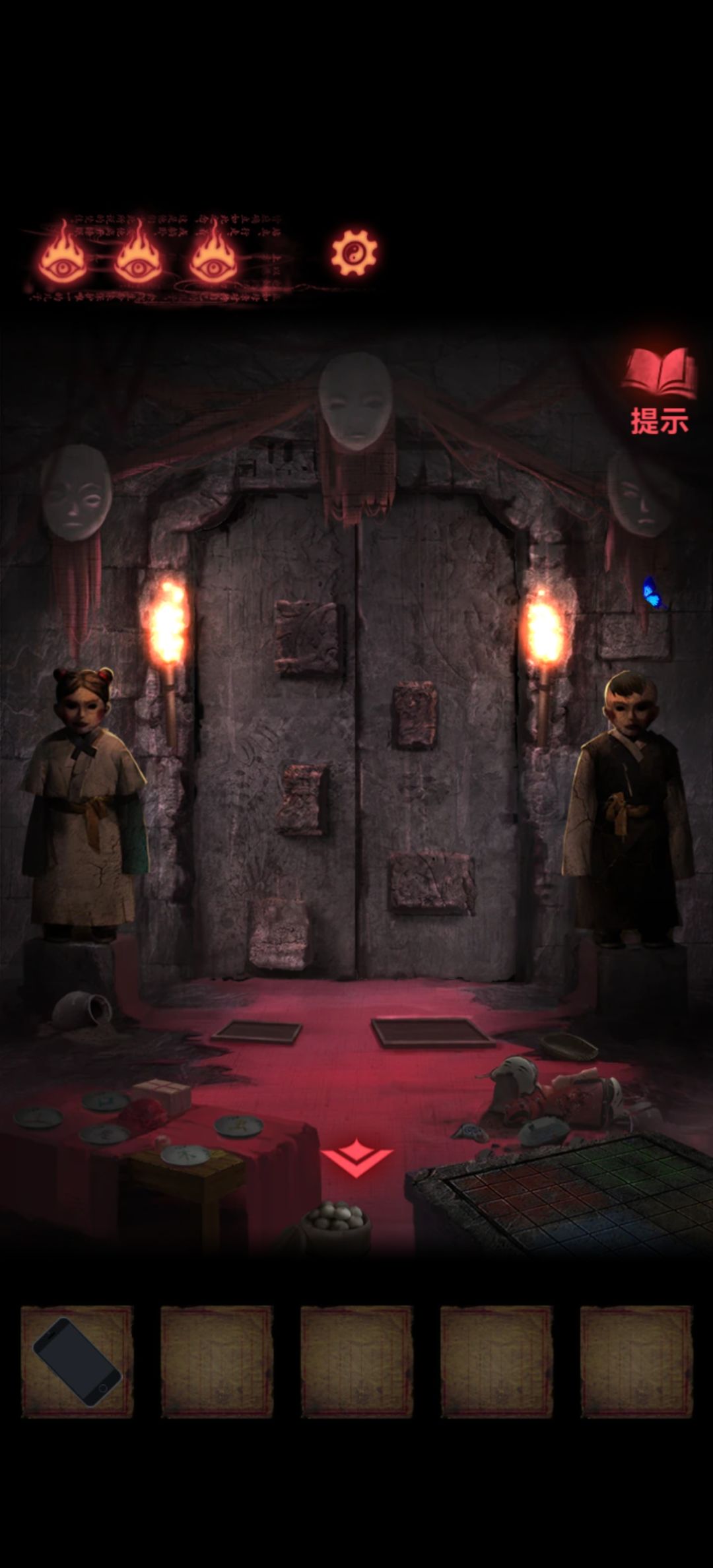 回到第一个场景把木剑也给男童供上,开手机会有高能小心点,打开手机就能看到两个熊孩子胳膊所指的方向交汇在一块石板上,关手机点一下再打开会发现变了,那就按这个顺序挨个点吧,点完门就开了本章结束。