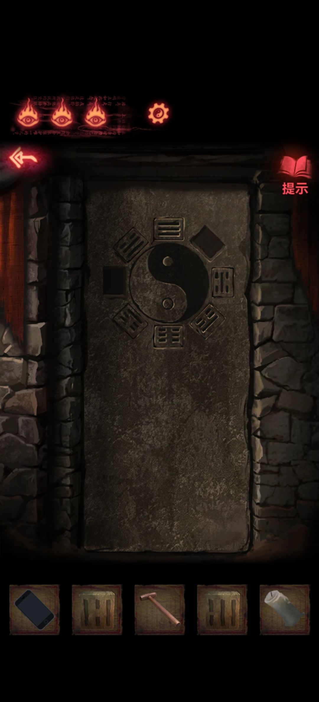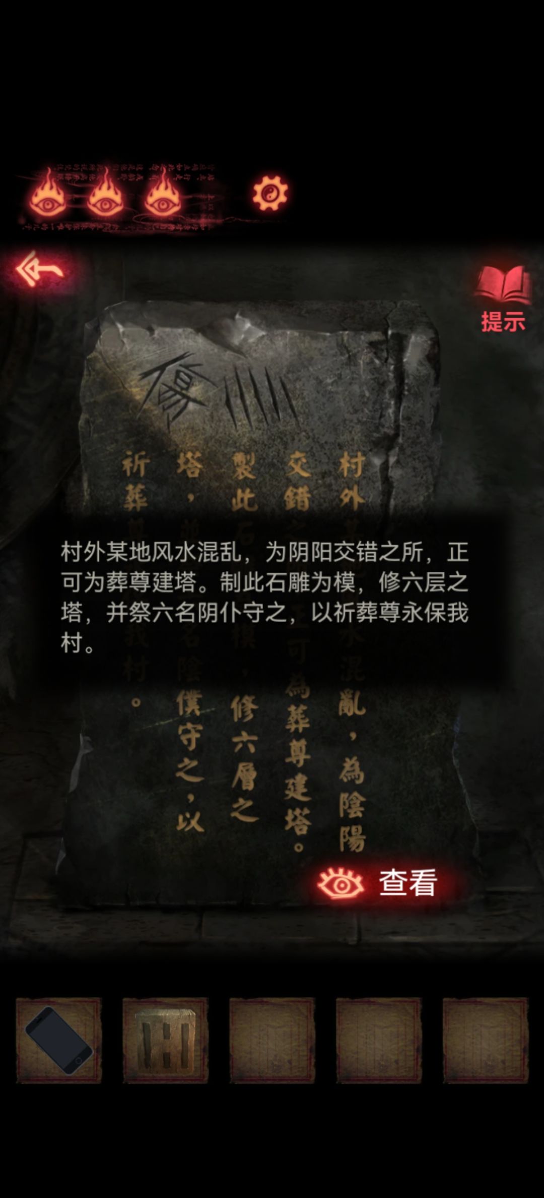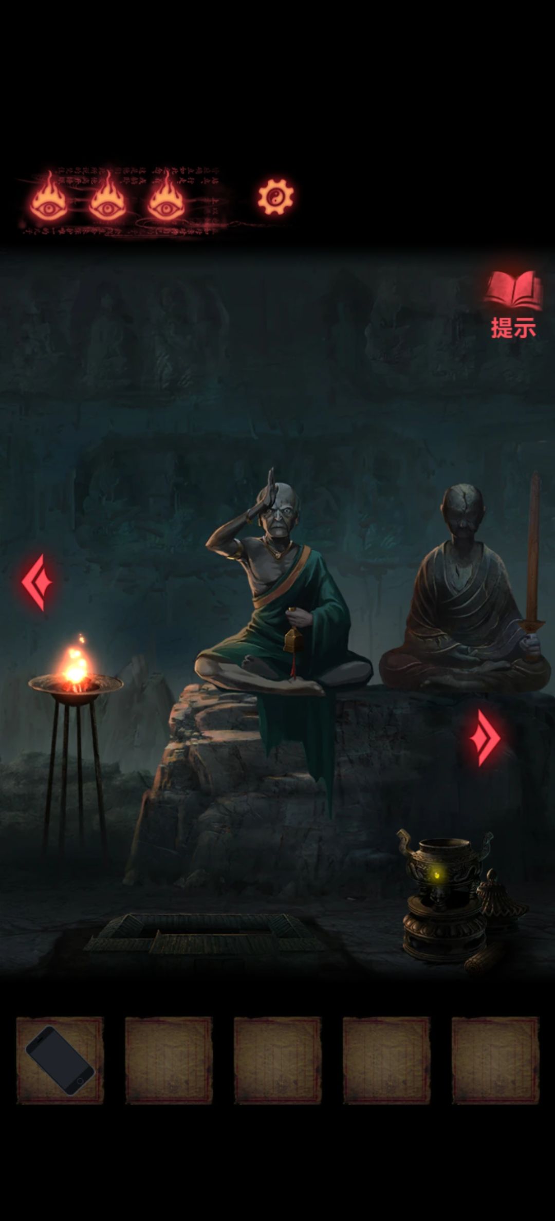 回到第一个场景把木剑也给男童供上,开手机会有高能小心点,打开手机就能看到两个熊孩子胳膊所指的方向交汇在一块石板上,关手机点一下再打开会发现变了,那就按这个顺序挨个点吧,点完门就开了本章结束。