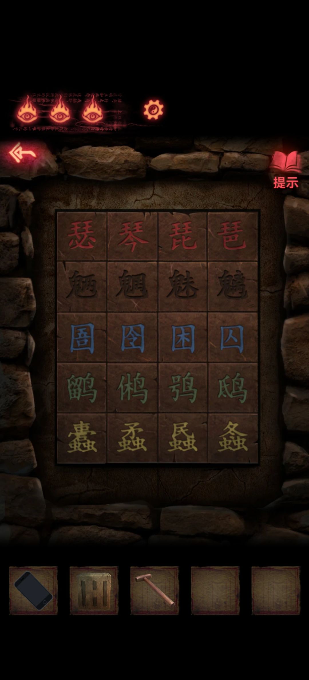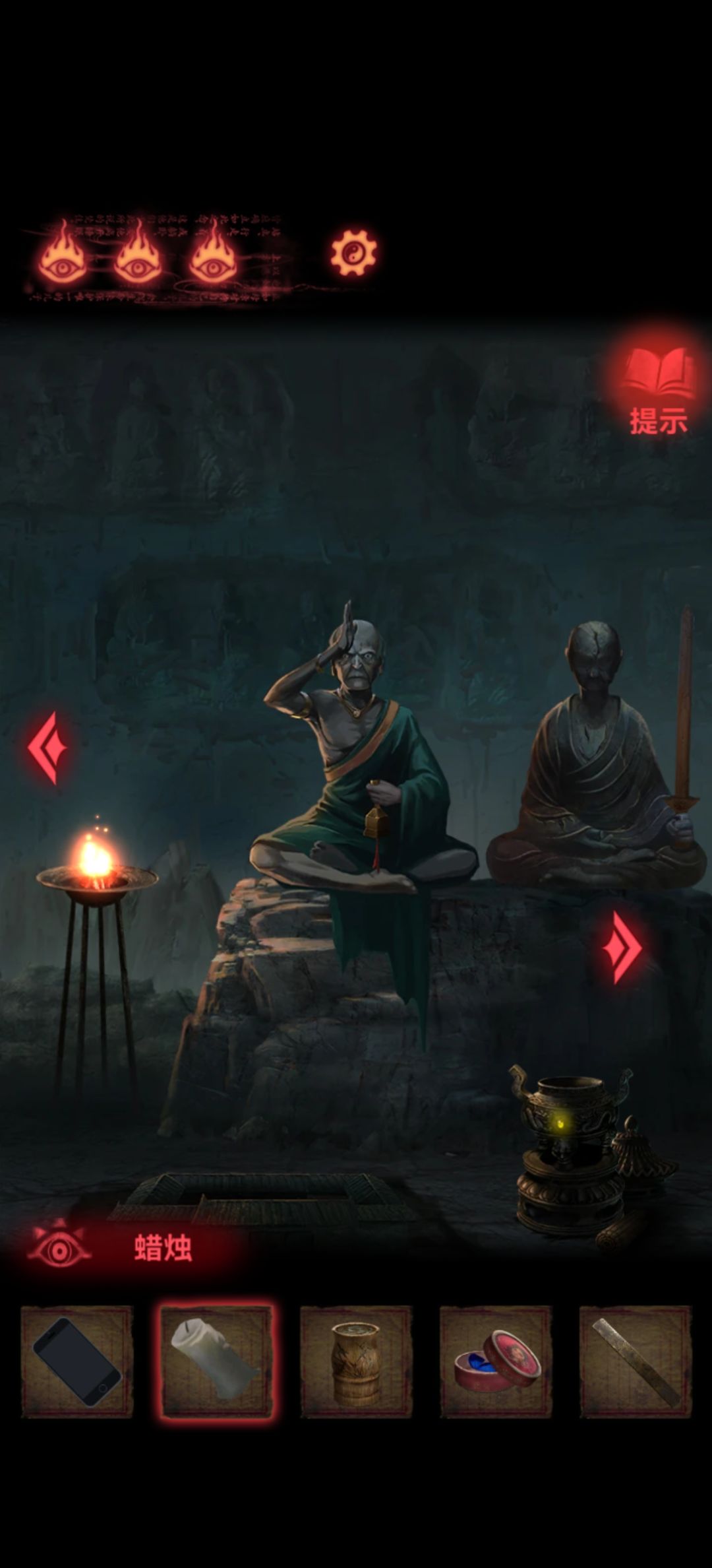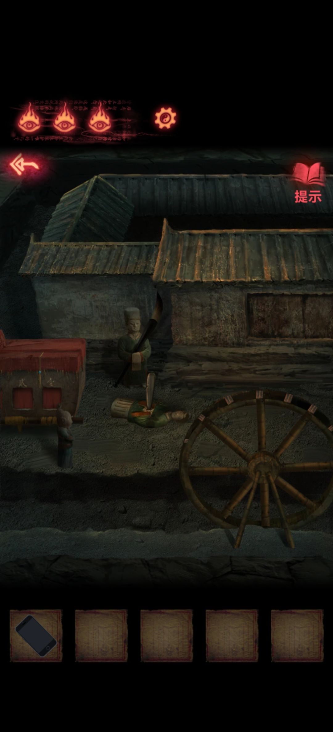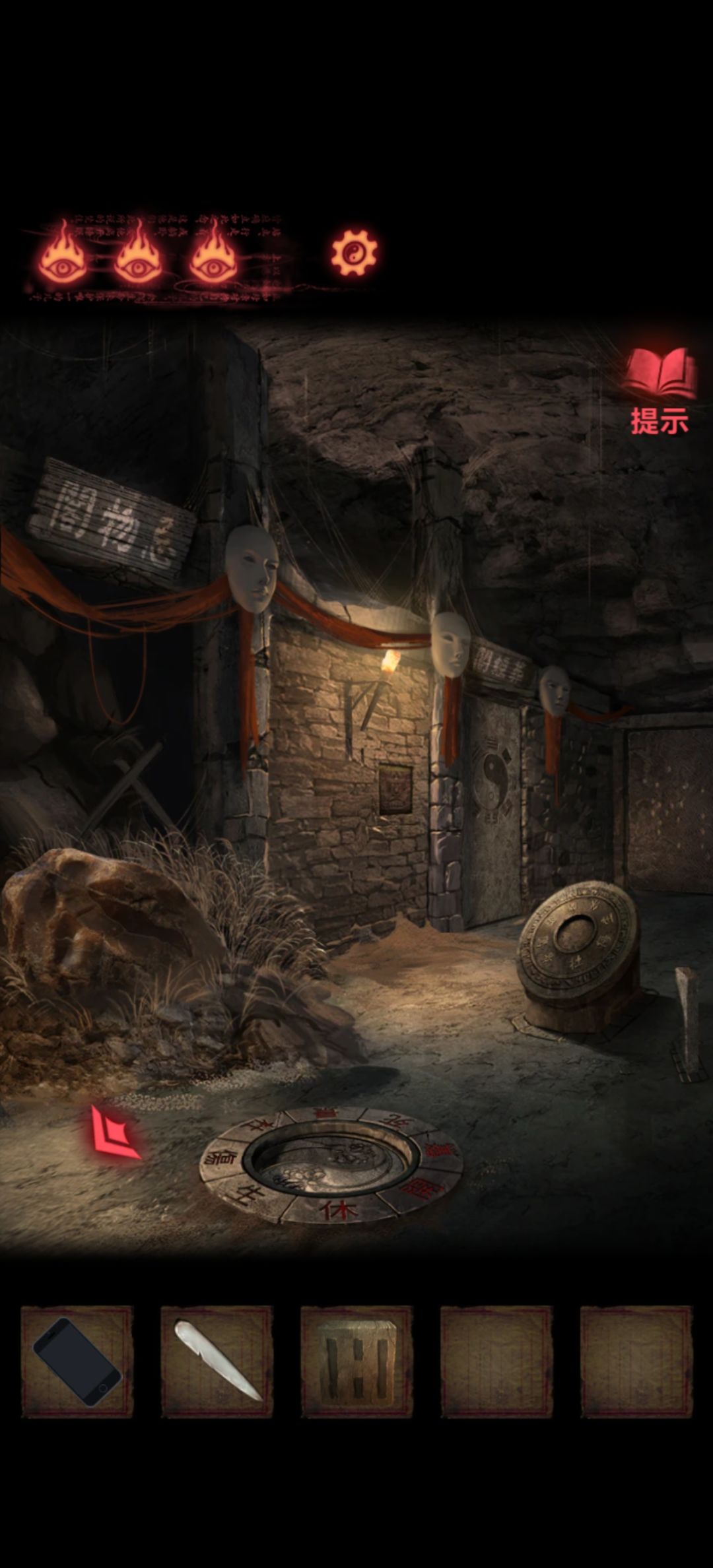 回到第一个场景把木剑也给男童供上,开手机会有高能小心点,打开手机就能看到两个熊孩子胳膊所指的方向交汇在一块石板上,关手机点一下再打开会发现变了,那就按这个顺序挨个点吧,点完门就开了本章结束。