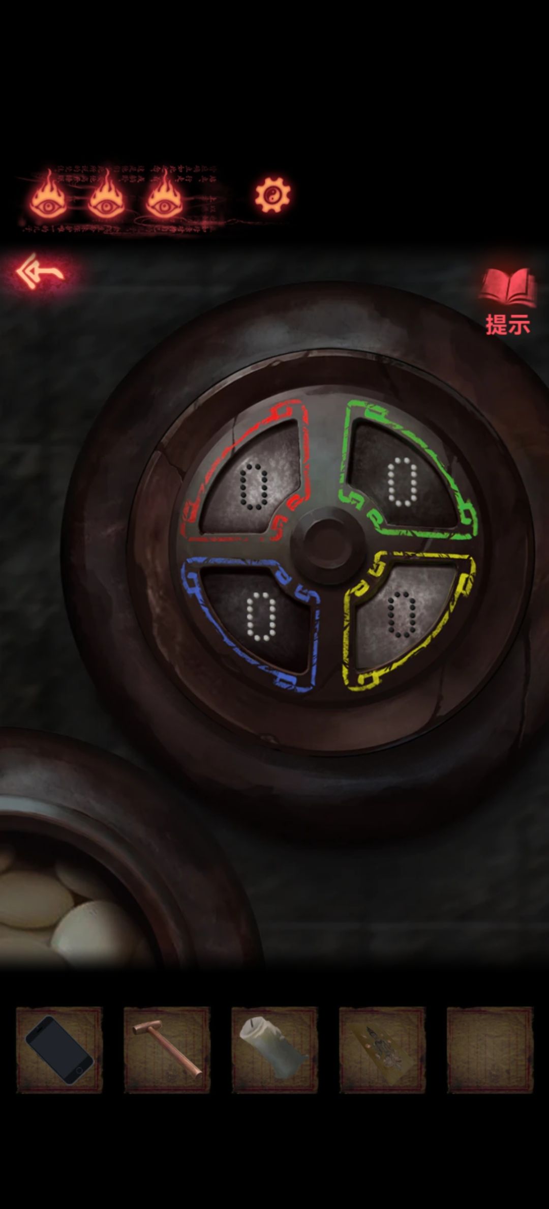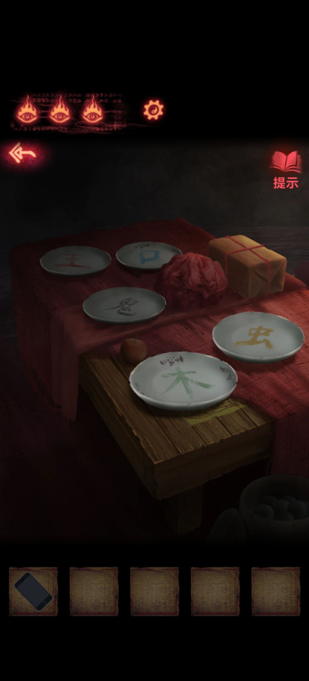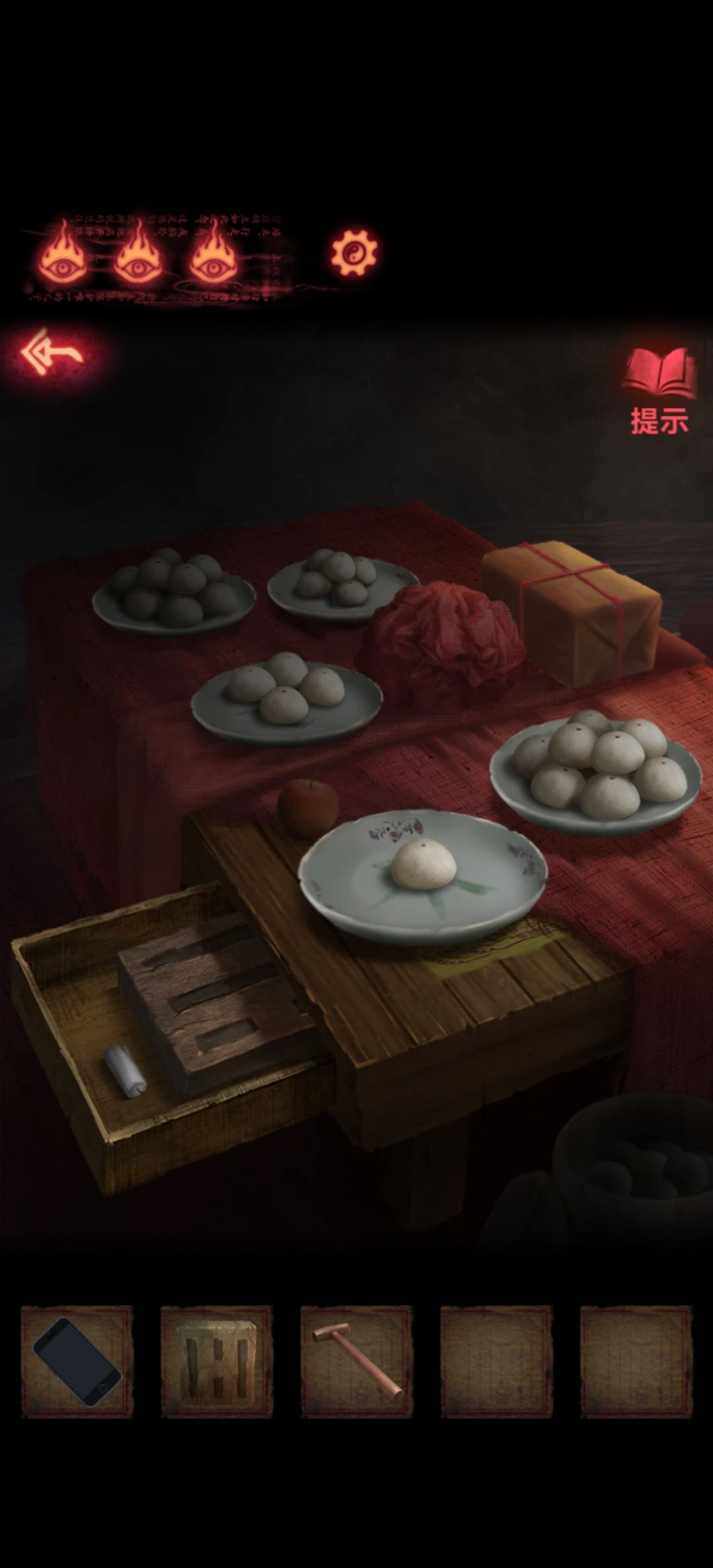 回到第一个场景先把左下角盘子谜题解了,点一下盘子盘子里就会自动多一个包子(或者馒头),数量就是前面各色数量,放好后会自动打开个抽屉里面是另外一块石板和白色蜡烛。