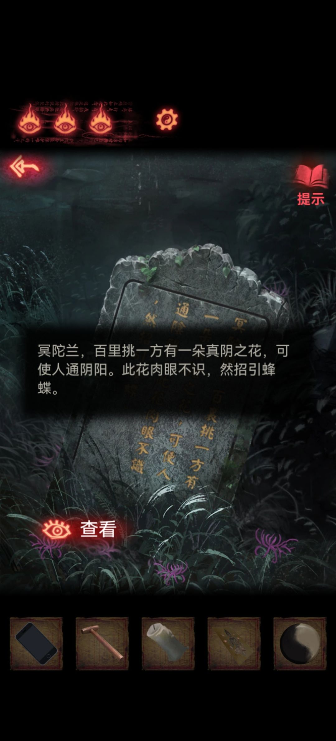 不着急走点旁边花花提示味道很熟悉在哪里闻过,然后查看石碑知道冥陀兰只有一朵真阴之花,凭眼睛找不到但是蝴蝶能找到,旁边水滴从高空不停滴落。