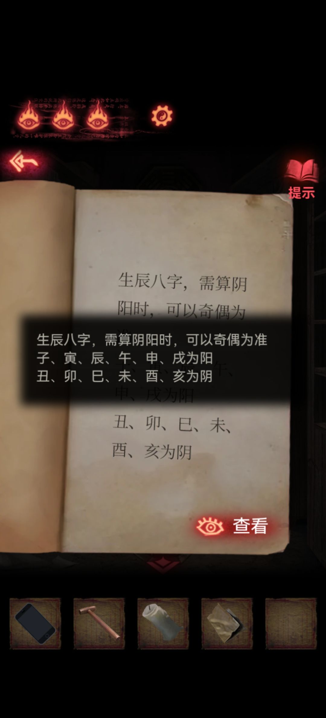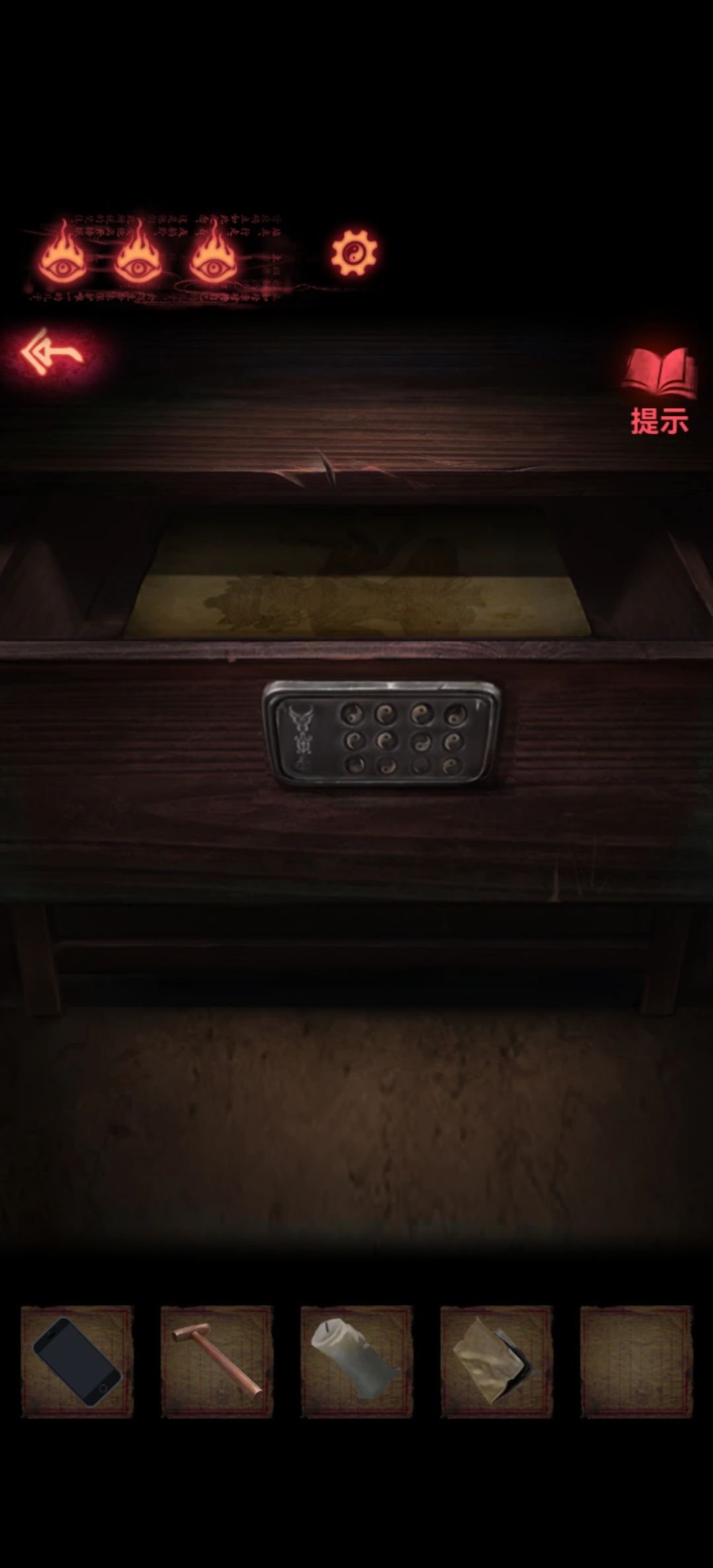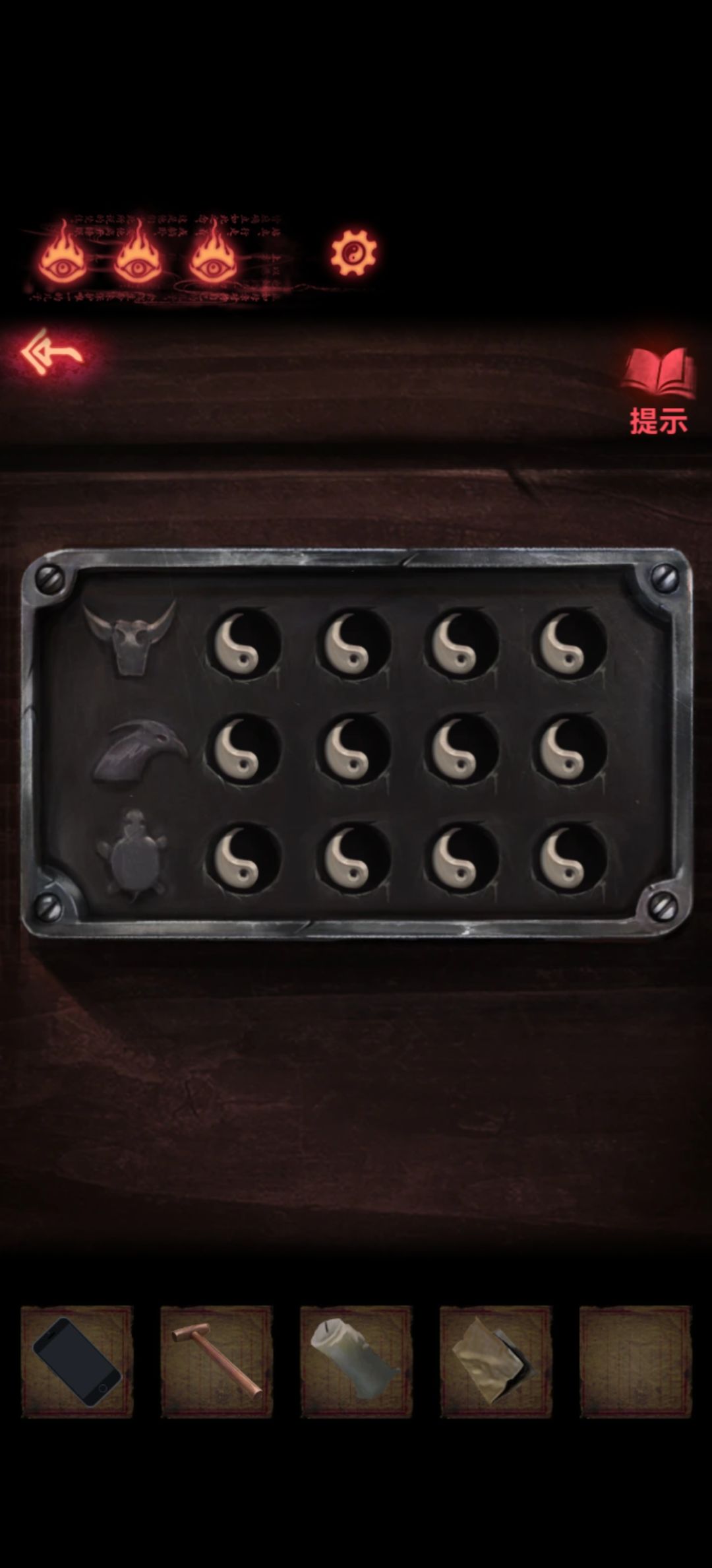 然后先看一眼柜子第一层密码提示是牛、鸟、乌龟,而右边是四个八卦图案,点一下会变暗,第二层没有把手只有个圆形凹槽,然后我们就可以开始仔细研究旁边书籍找线索了。