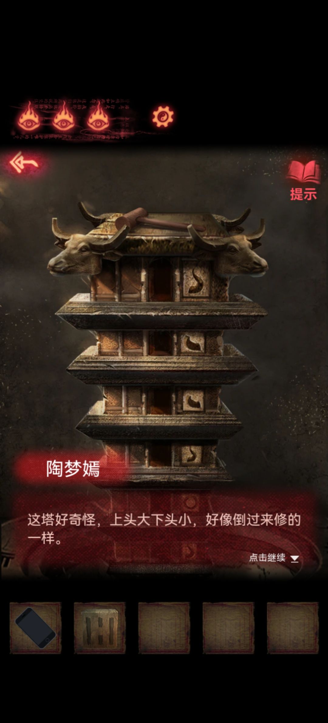 点塔就有提示好像是倒着修的,然后观察塔上面的雕像是牛头,那么图案是左右角和鼻环,因为是倒着所以从下往上记一下右鼻右左左右,顺便拿走塔顶小木锤走人。