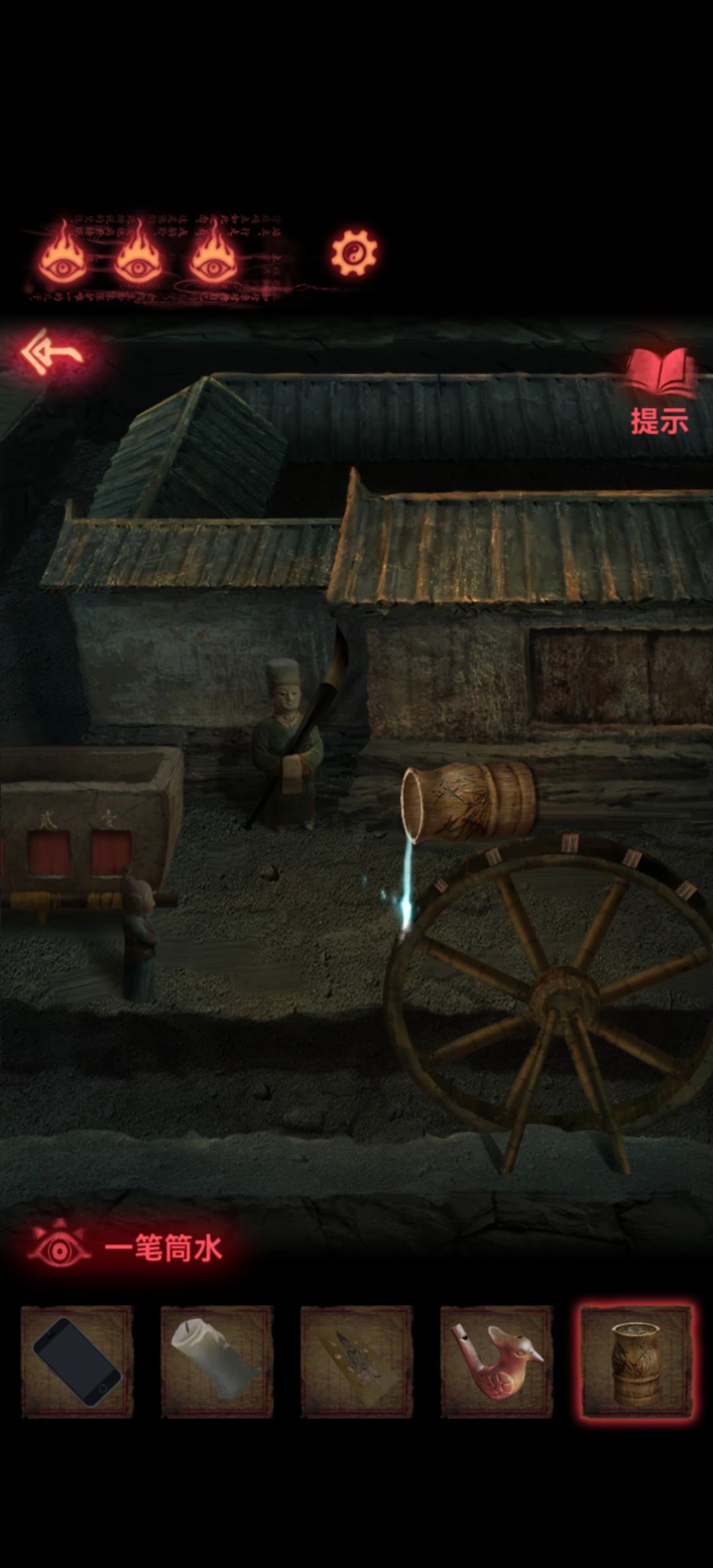 回老头场景,找到泥房子把刚刚接到的水倒在水车上,后面房门就开了拿到一个胭脂盒。