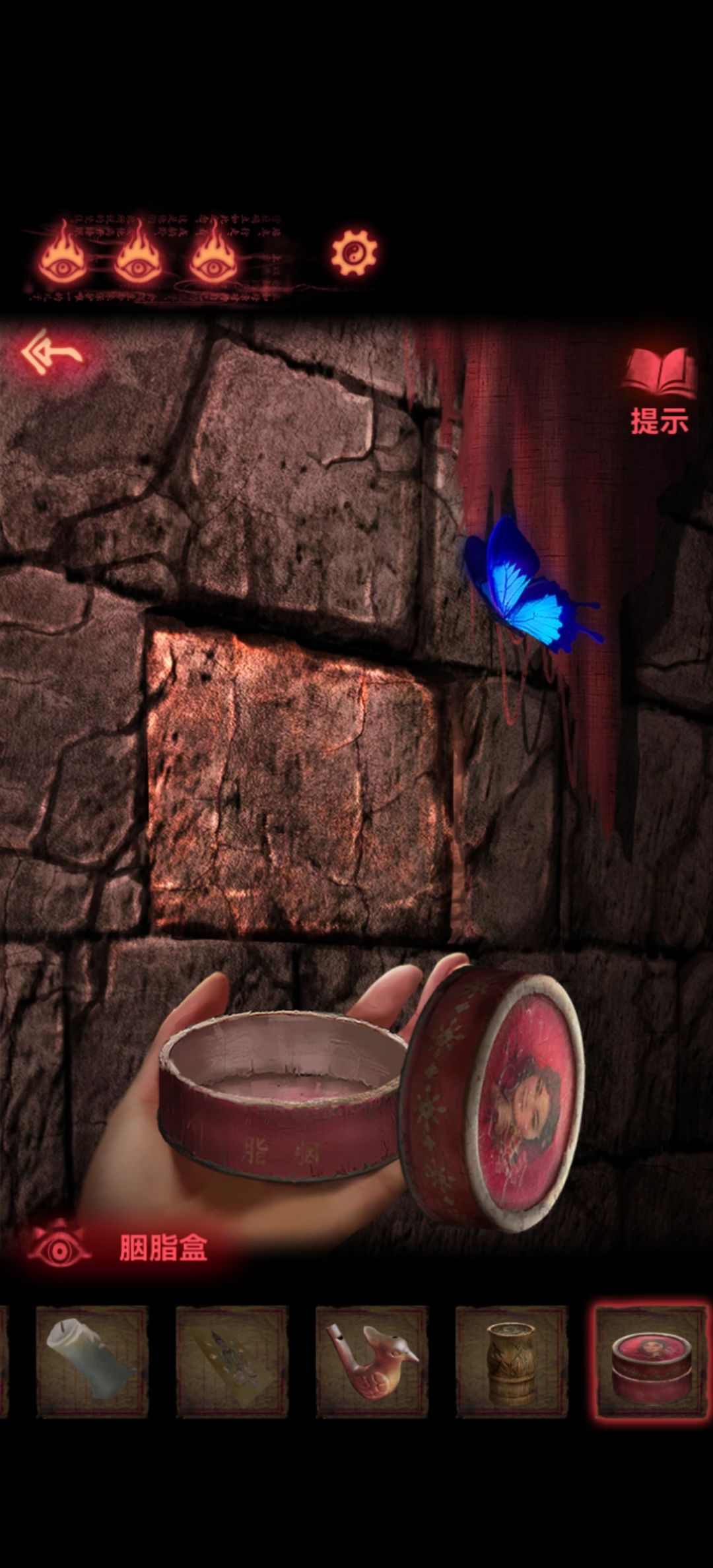 拿着还有余香的胭脂盒到石门场景,打开胭脂盒就能把蝴蝶引诱进来了。