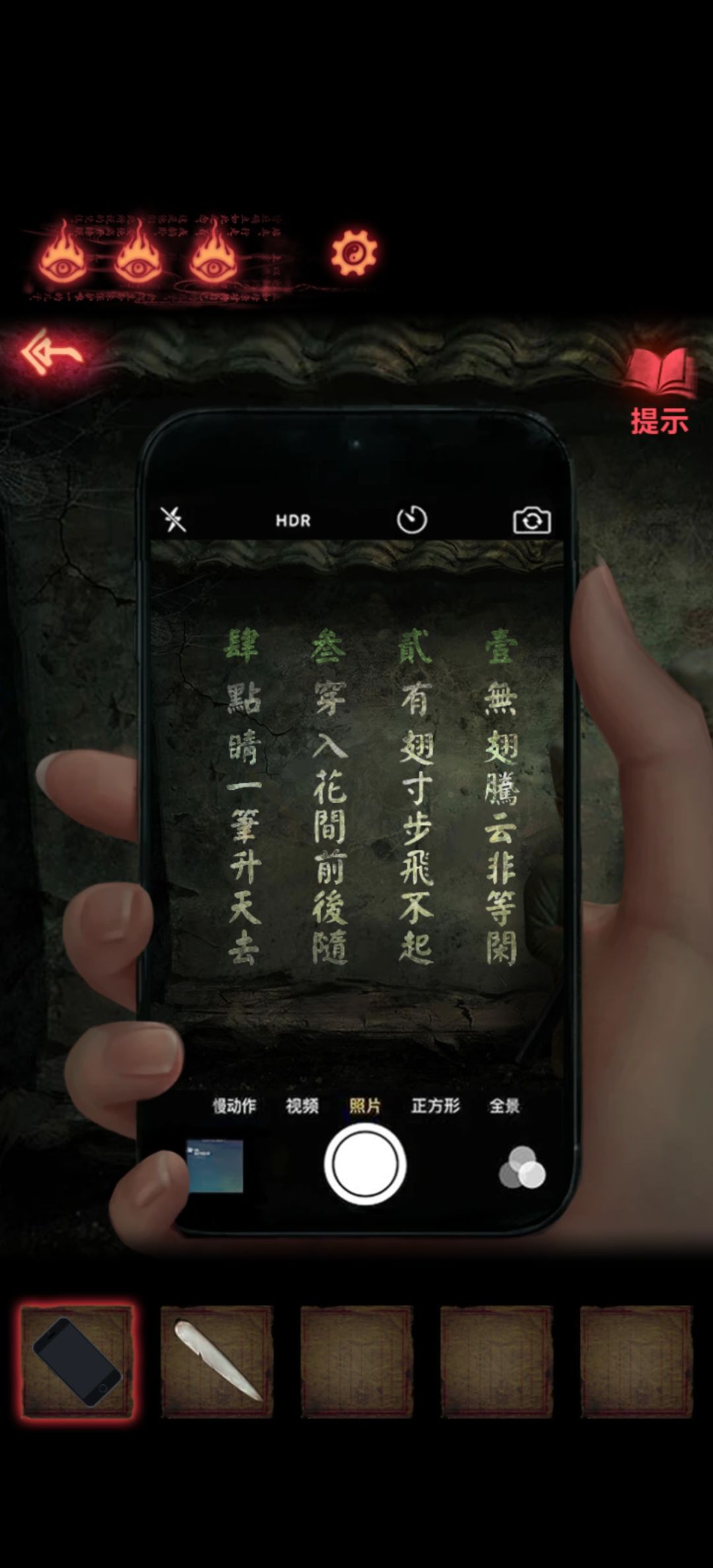 查看一下拿笔小人后面墙壁会提示好像看到了什么,掏出手机看墙壁就能看到线索了,其实就是四个小谜语,1是没翅膀能腾云驾雾,2是有翅膀能吃不能飞,3是我和你缠缠绵绵翩翩飞~飞越这红尘永相随~4是画龙点睛,基本都猜到了吧~