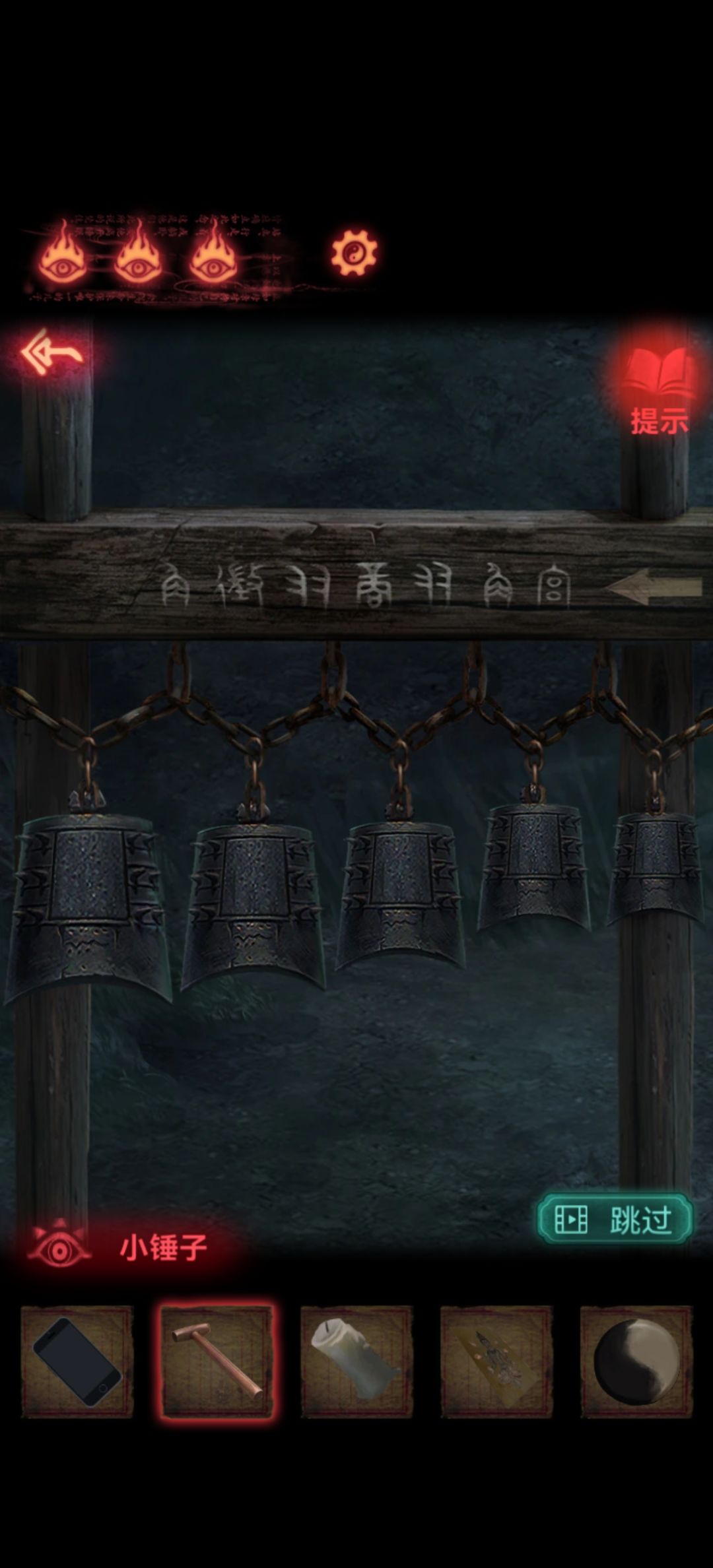 用小木锤点编钟就可以敲钟了,上面有需要敲的顺序,先挨个敲一遍就可以知道钟是按照宫商角徽羽排列的,那么换算成数字需要敲得就是1352543,敲完了就可以拿到一个小哨子~不就是石门旁边女童喜欢的东西了吗。