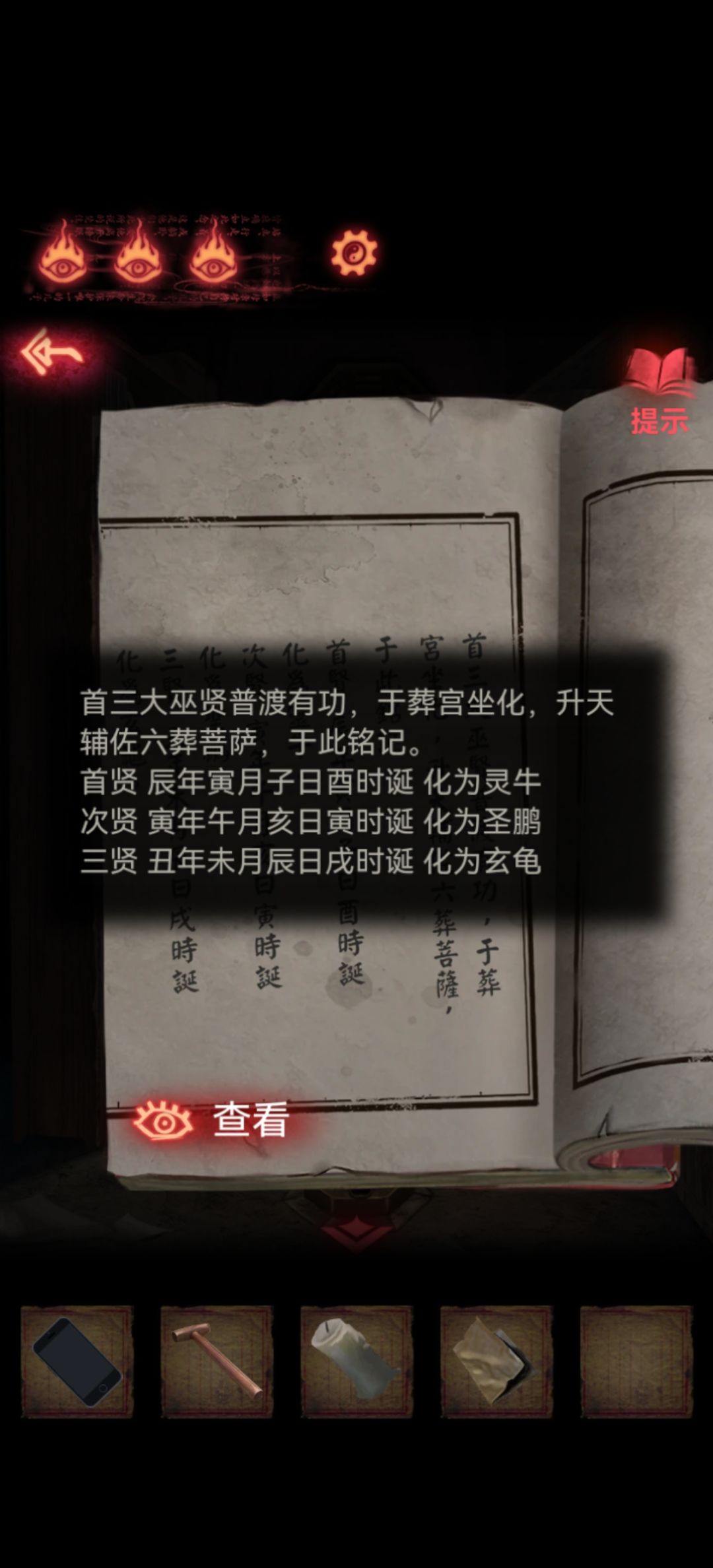 右边红书提示三大巫贤第一个牛是辰年寅月子日酉时,第二个鸟是寅年午月亥日寅时,第三个龟是丑年未月辰日戌时。
