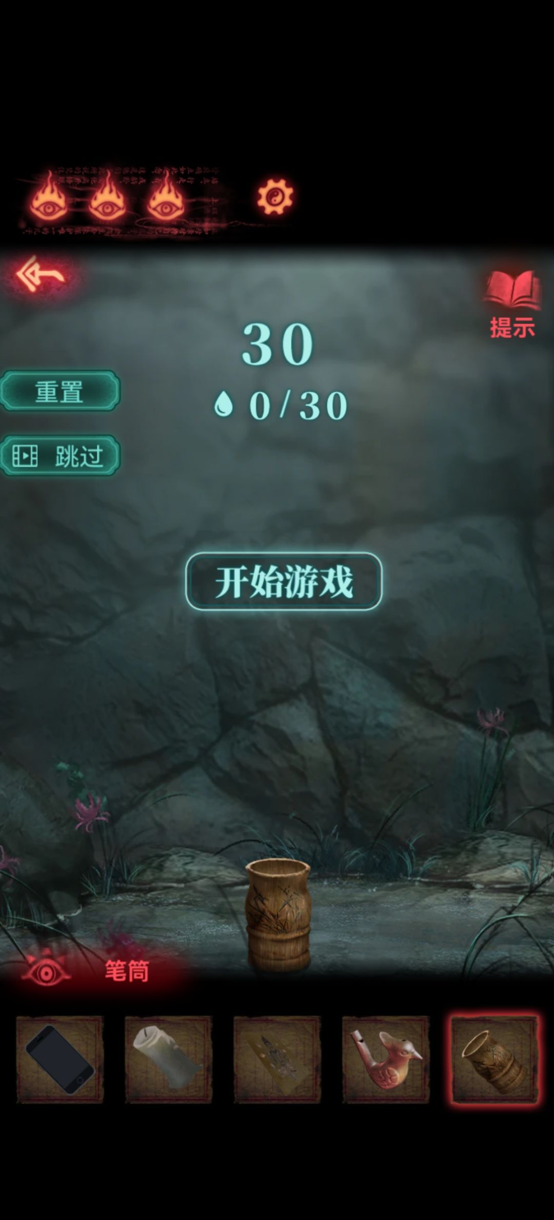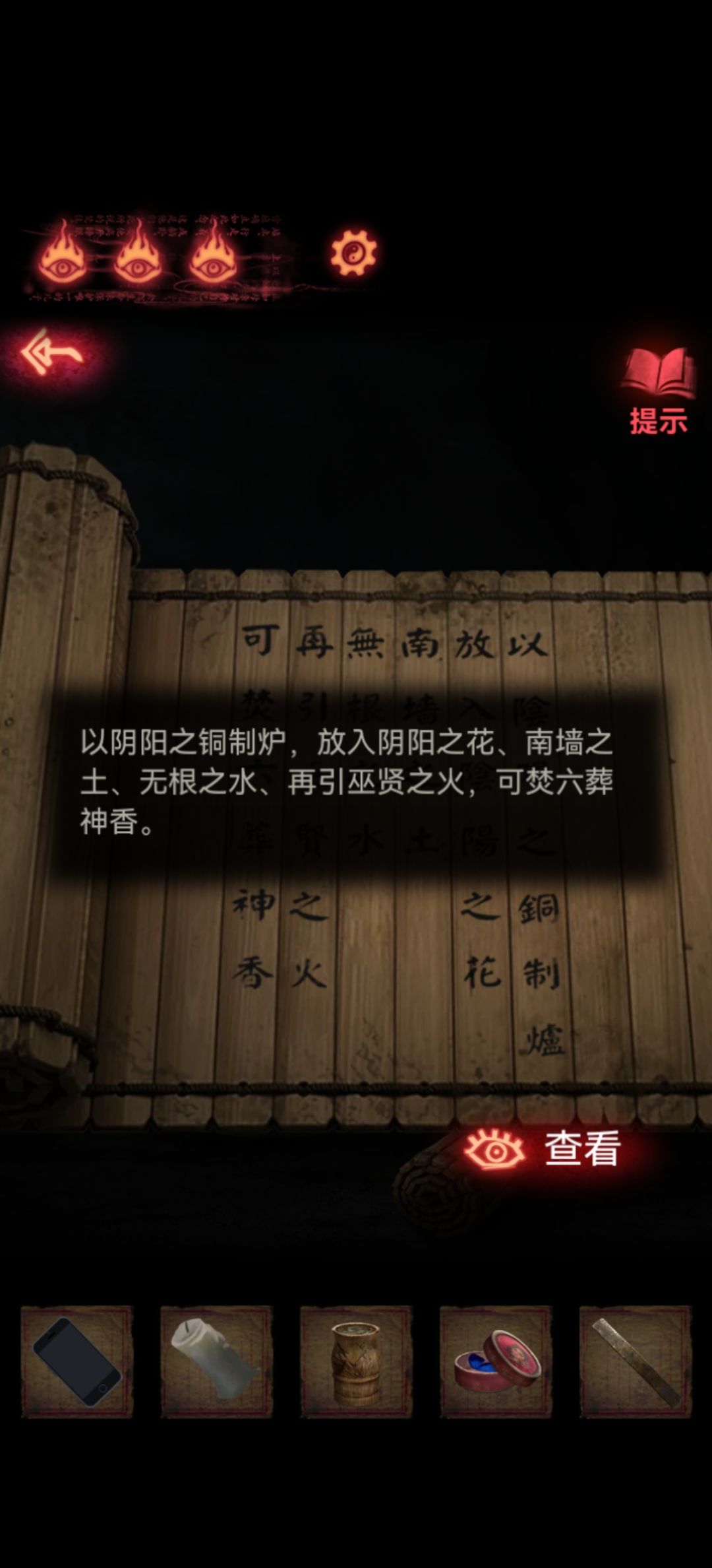 路过老头又开始哔哔哔,女主已经见怪不怪了,这里我们终于查看一下右下角的竹简吧,需要收集的东西是阴阳之花+南墙之土+无根之水+巫贤之火。