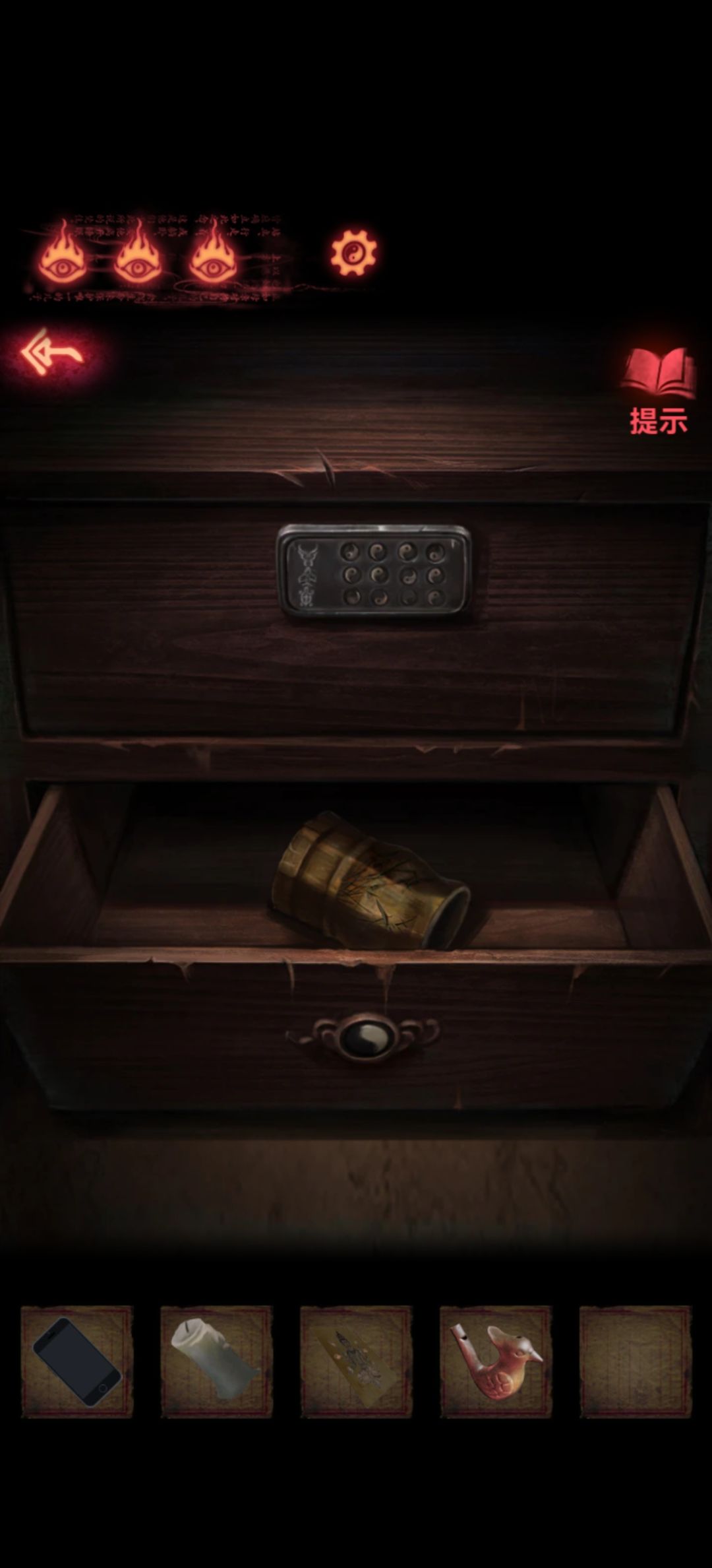 回头回头先来藏经阁把小八卦放到柜子第二个抽屉上就能打开抽屉了,获得个笔筒。