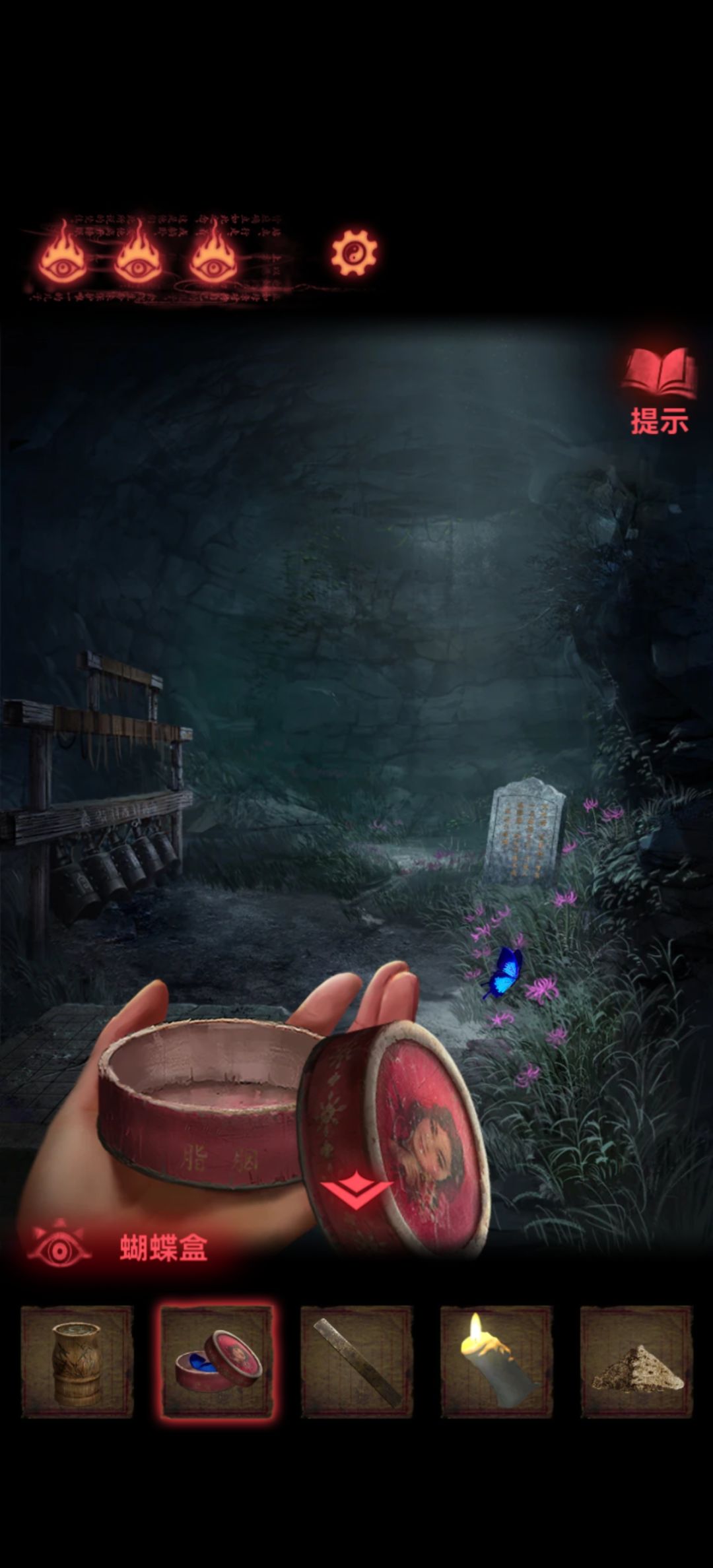 回到最右边场景放出胭脂盒中的蝴蝶,蝴蝶停的花就是阴阳之花了,用锋利铜尺割下来,这些东西齐全了炼金......不是,炼香去。