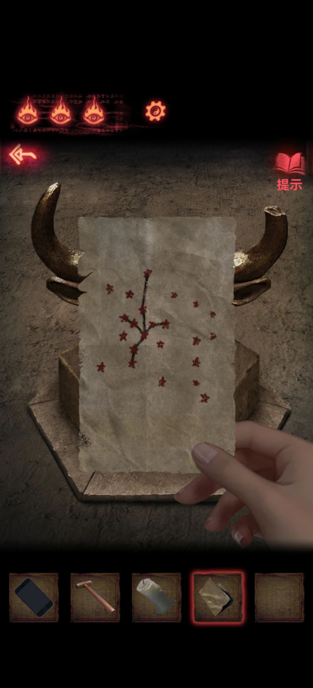 按照刚刚顺序右鼻右左左右点的话是不行的,仔细看牛头右角完整左角有残缺,而塔上图案完整的是左角,也就是说这个左右是牛的左右而不是手机屏幕的左右,把顺序换成左鼻左右右左就可以了,点完后牛嘴打开拿到个画了很多星星的纸片。