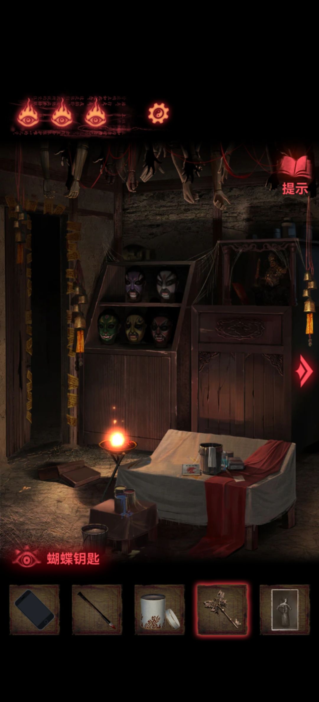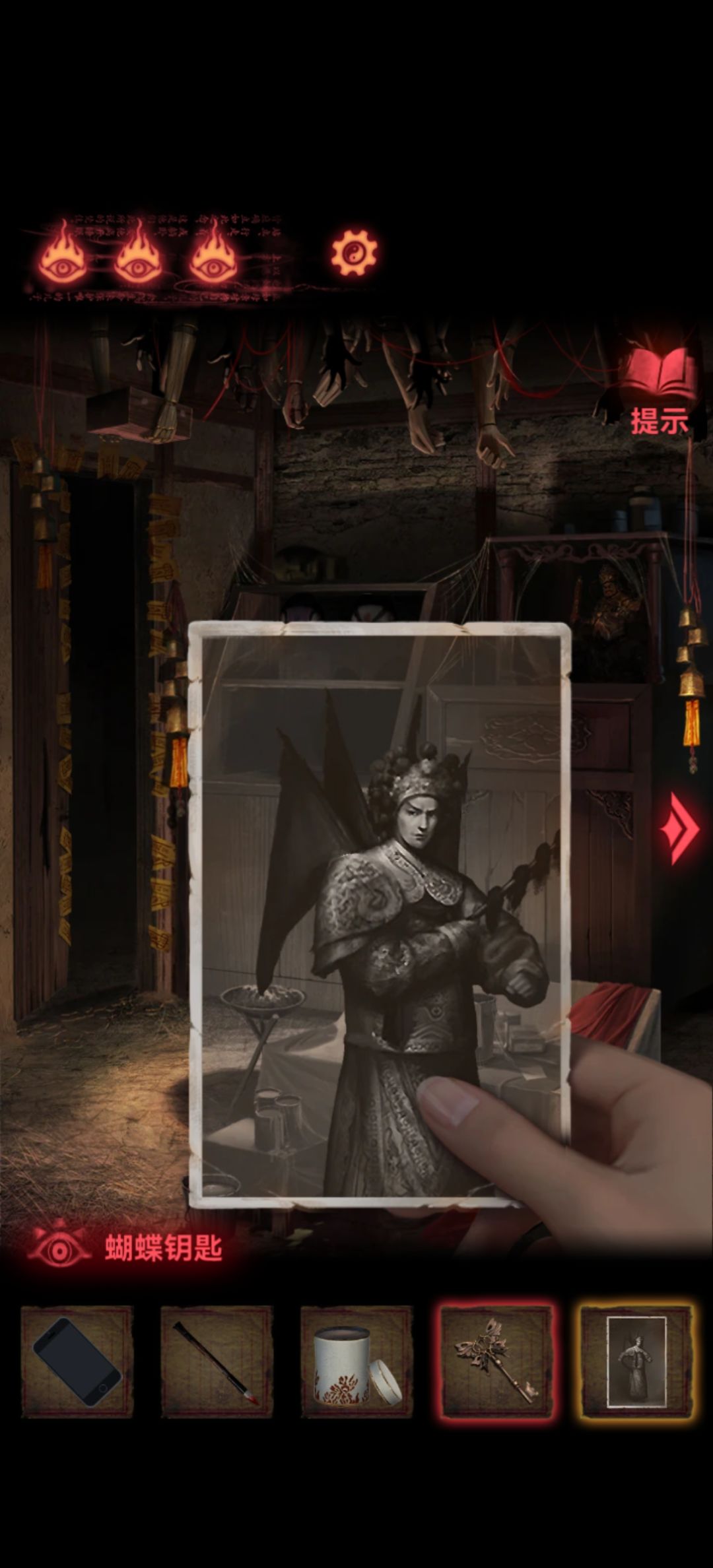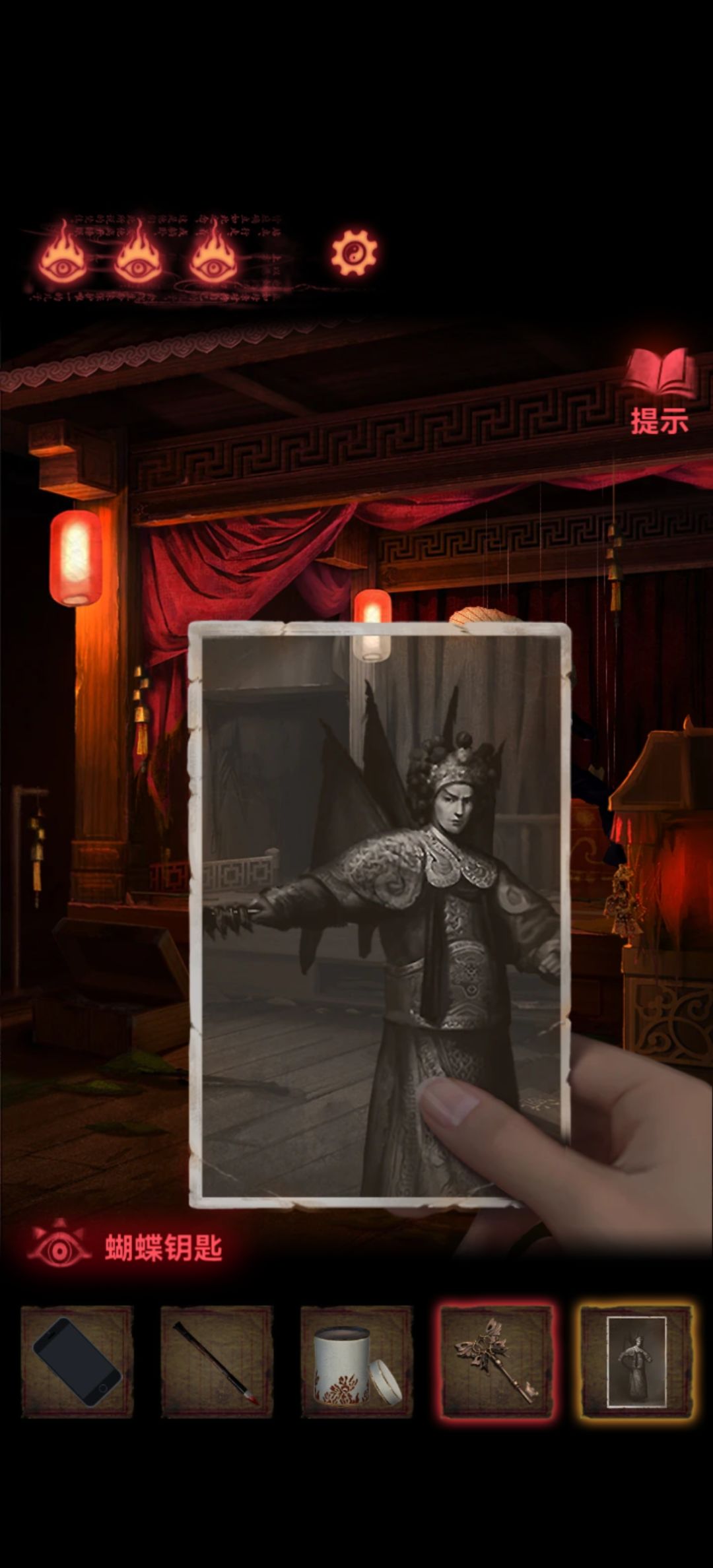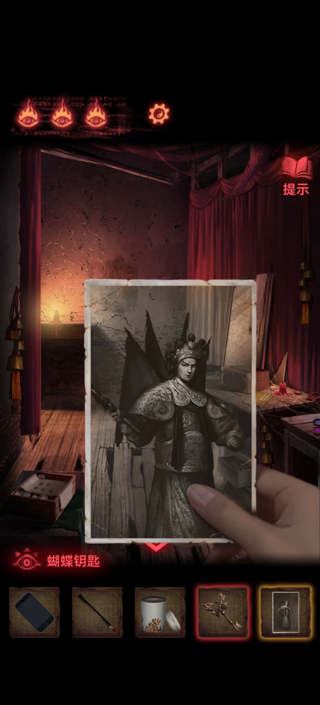 回到戏服倒地吓人的房间拿上戏服,拿出照片就发现照片里的人动作变了,马鞭所指的地方刚好有一串风铃,绝对不是巧合啦点风铃~点完之后照片里场景成了脸谱场景,自然就是我们下个目的地。