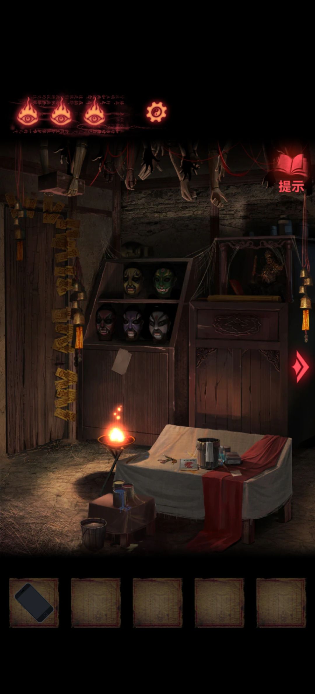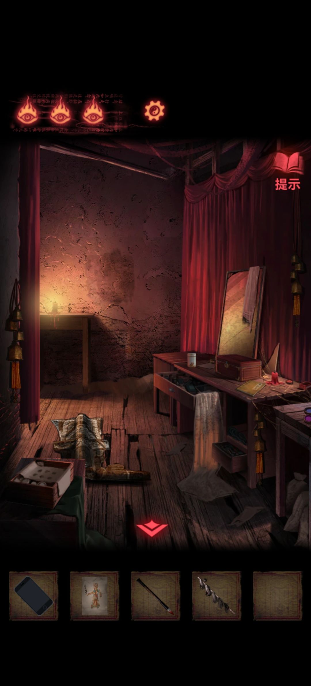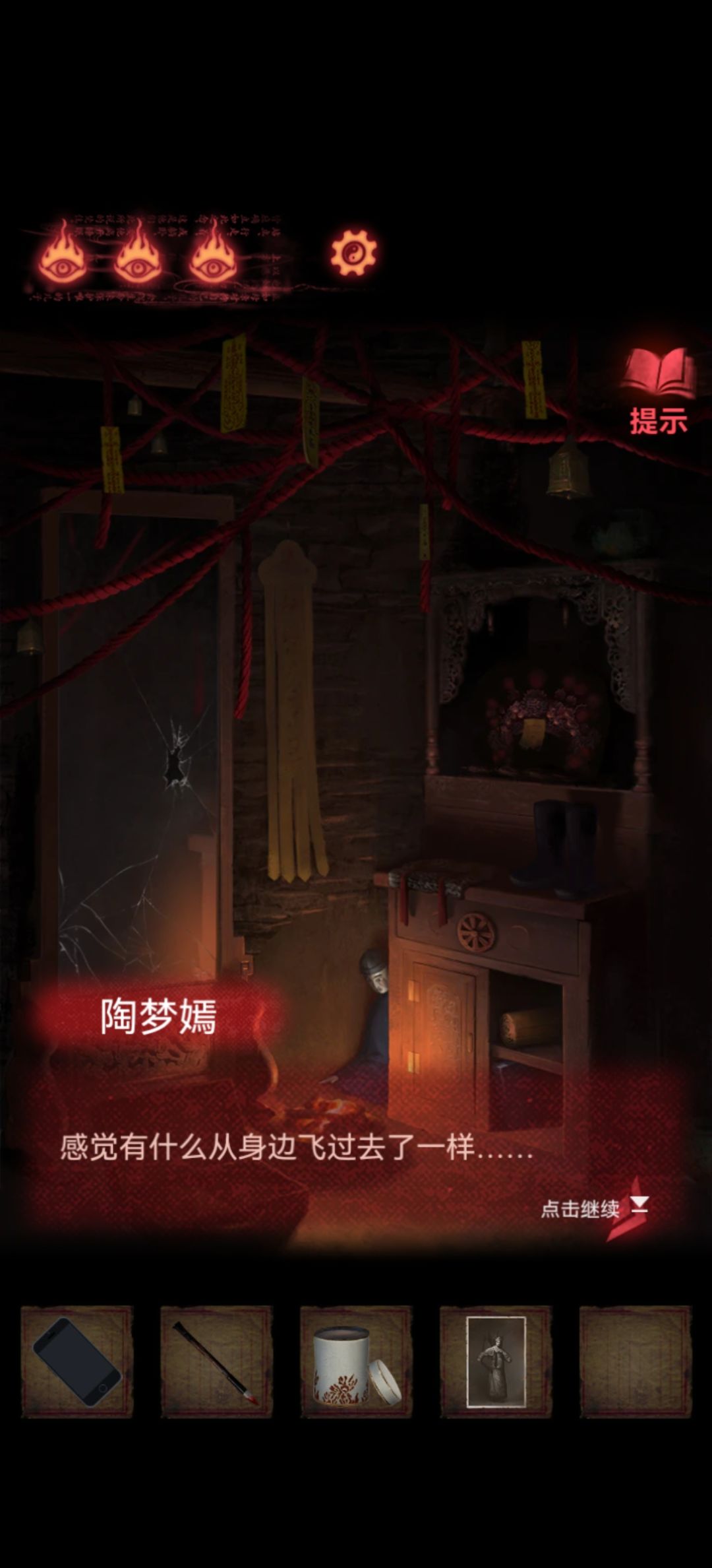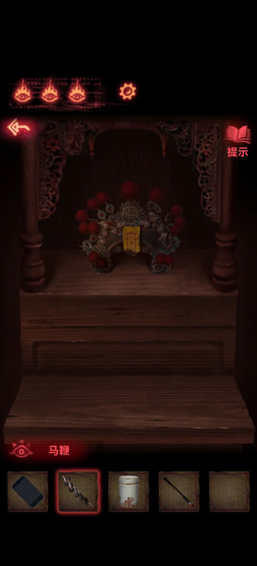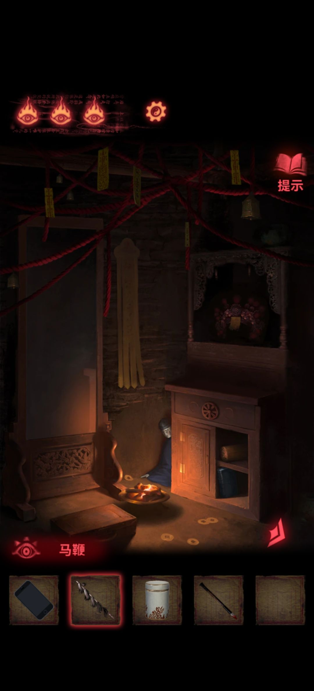 回到戏服倒地吓人的房间拿上戏服,拿出照片就发现照片里的人动作变了,马鞭所指的地方刚好有一串风铃,绝对不是巧合啦点风铃~点完之后照片里场景成了脸谱场景,自然就是我们下个目的地。