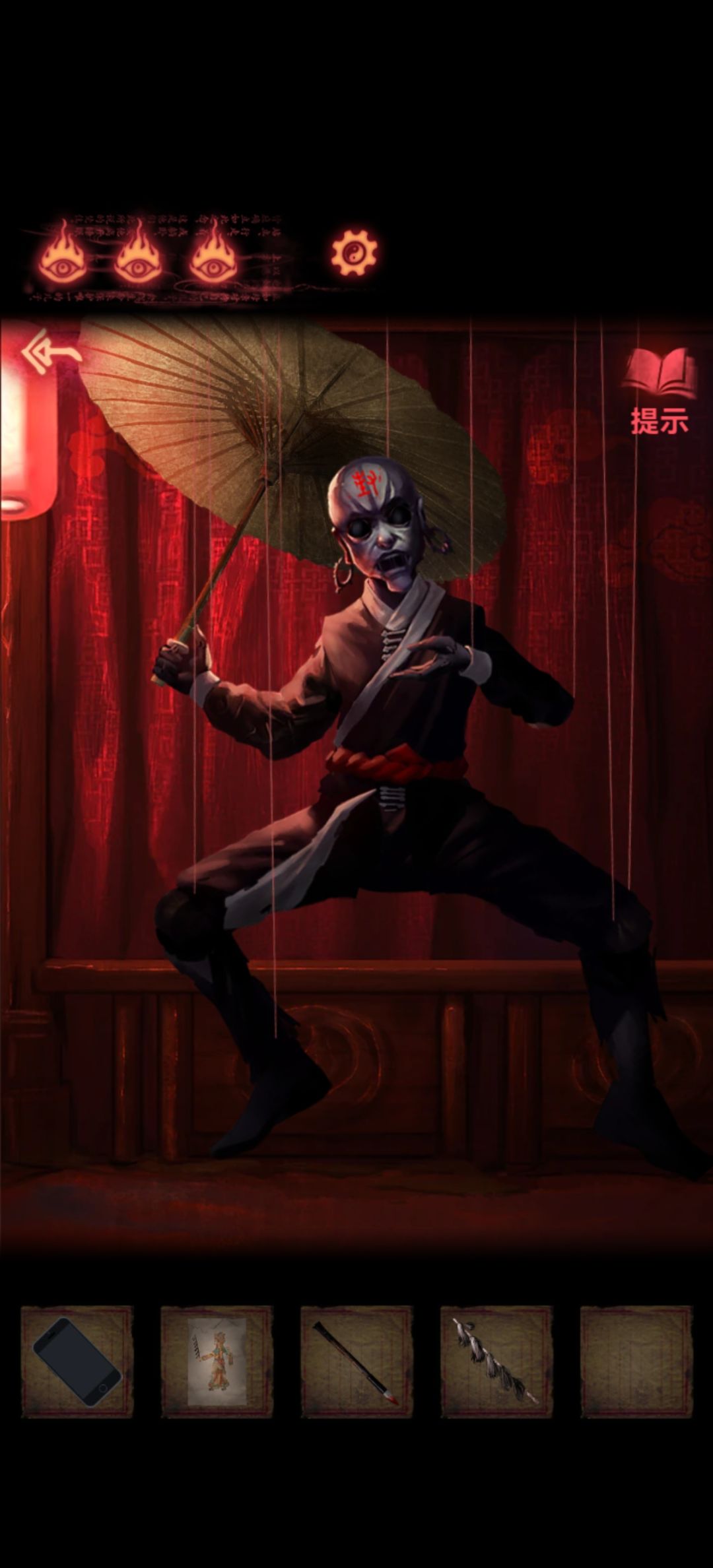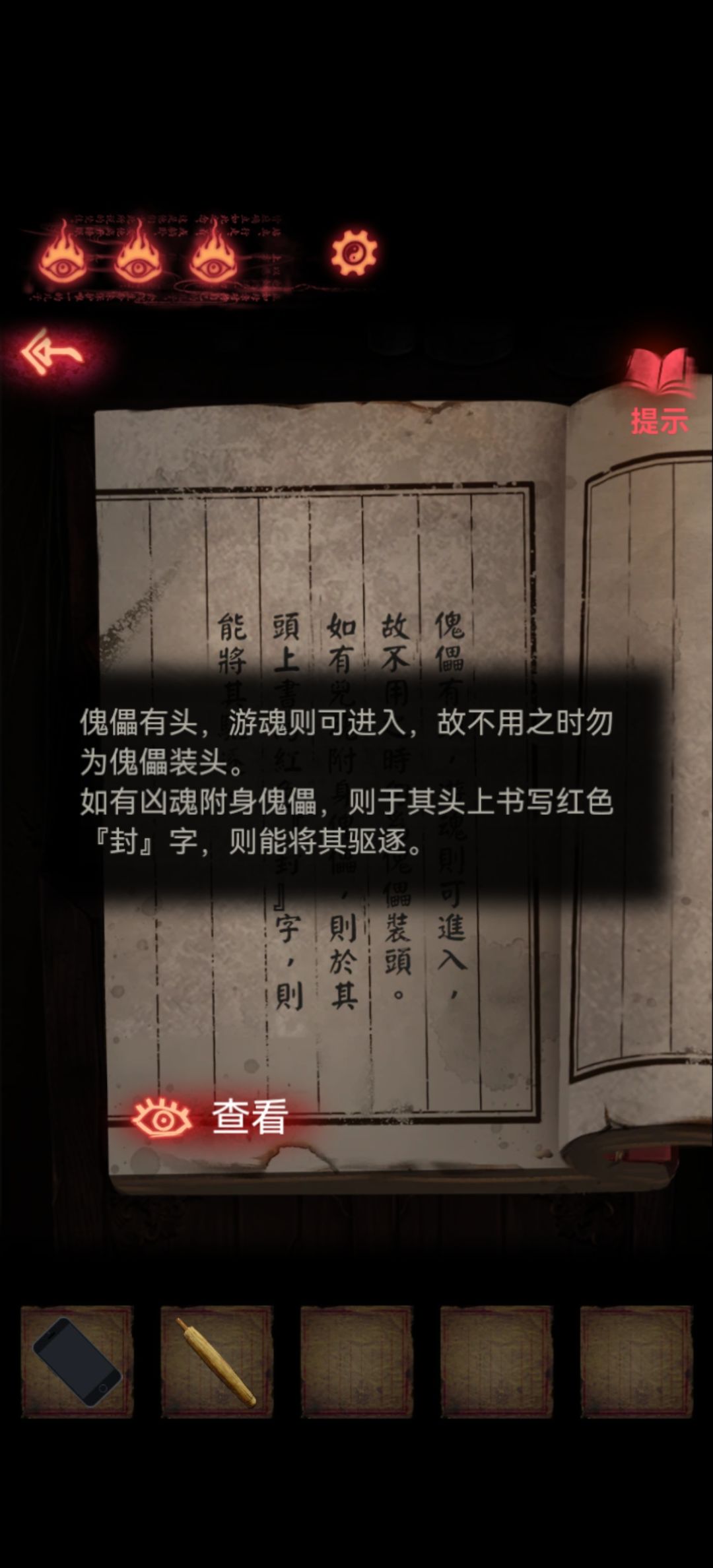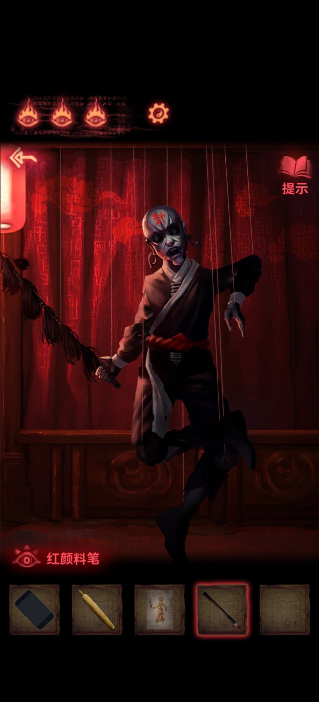 毛笔沾一下红色颜料,转头去找吓唬我们的木偶算账,头上红色封一写木偶就老老实实的了,先拿走他手里的武器——马鞭,再给他换上油纸伞木偶就能被改变动作了。