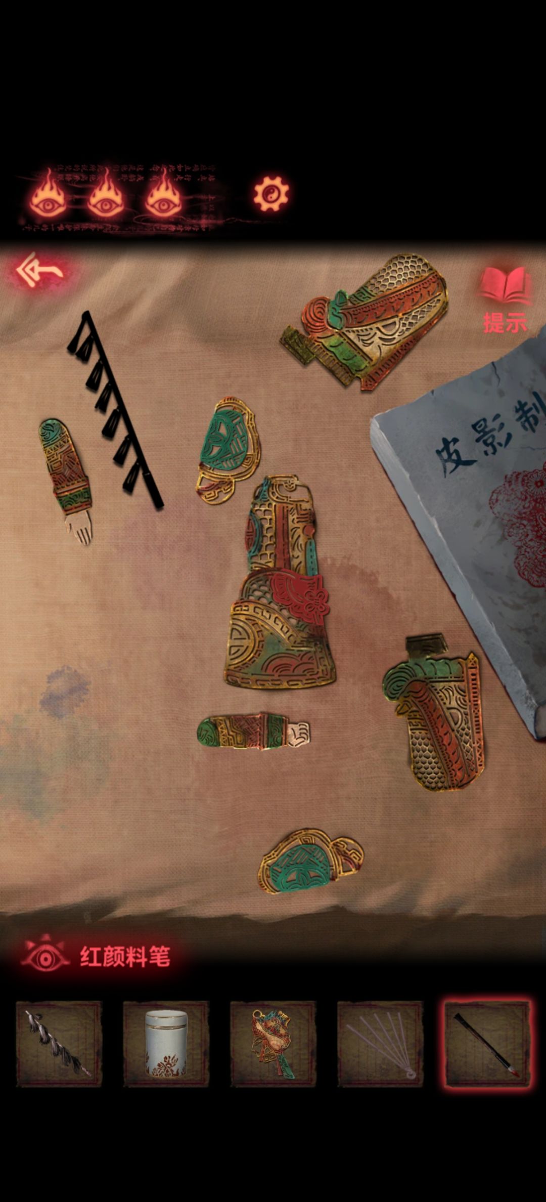 颜料上方小桌子上有四分五裂的皮影,不仅没有上完色还缺了部件,查看一下旁边的书提示要上完色、拼接之后出缀结操作杆。