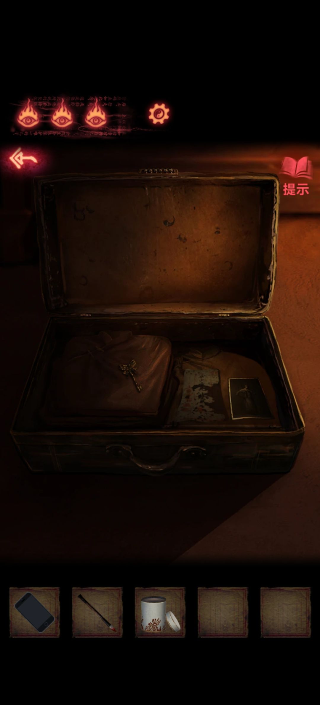 退出来到脸谱场景用空瓶子装一瓶卸妆水,左边的门打开了,不要怂直接进就能到一个贼阴间场景,虽然中间藏了个小纸人但是他真的不会动,中间有个密码箱需要个六位数密码。