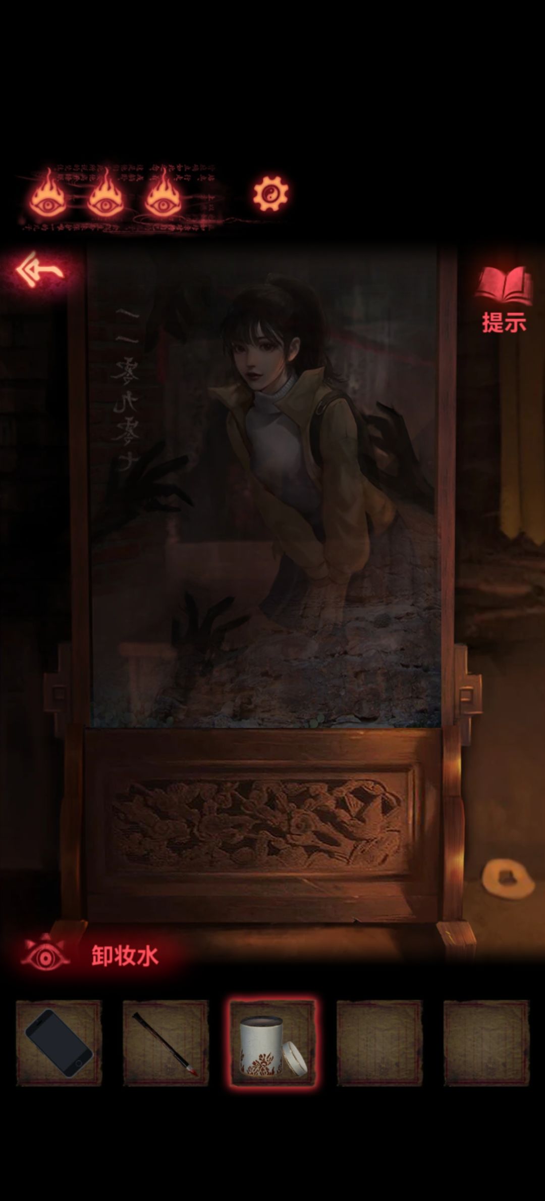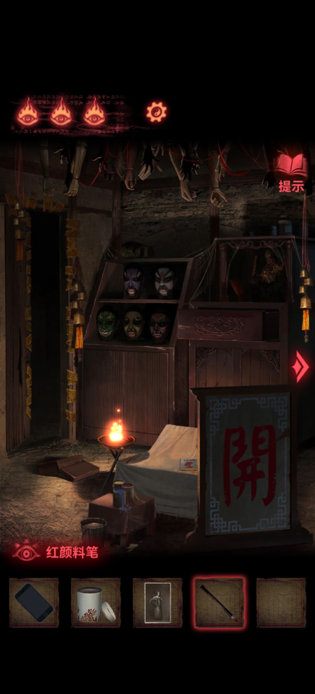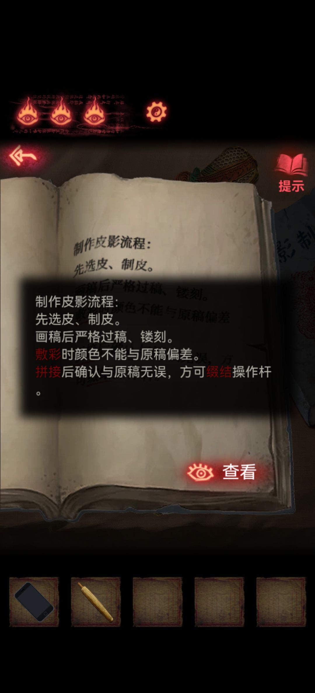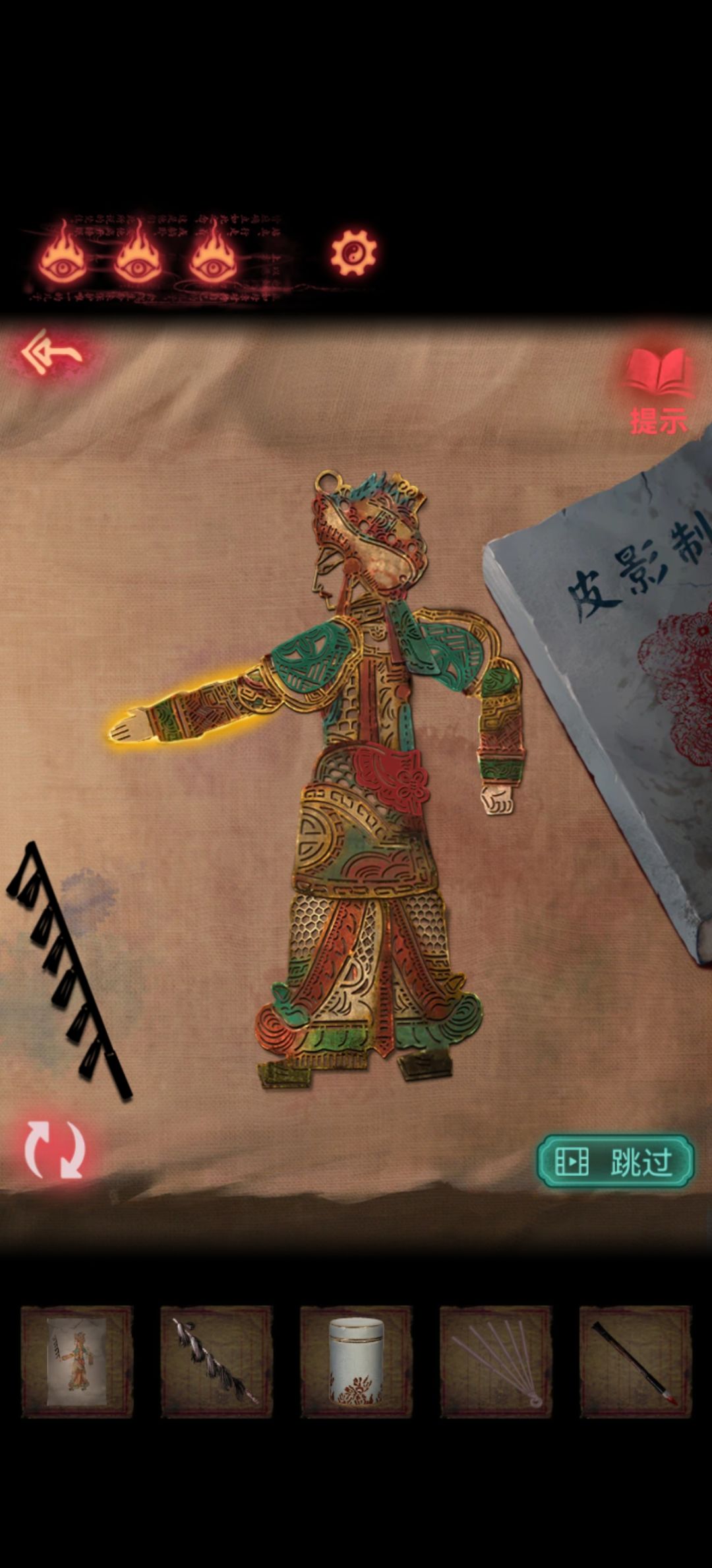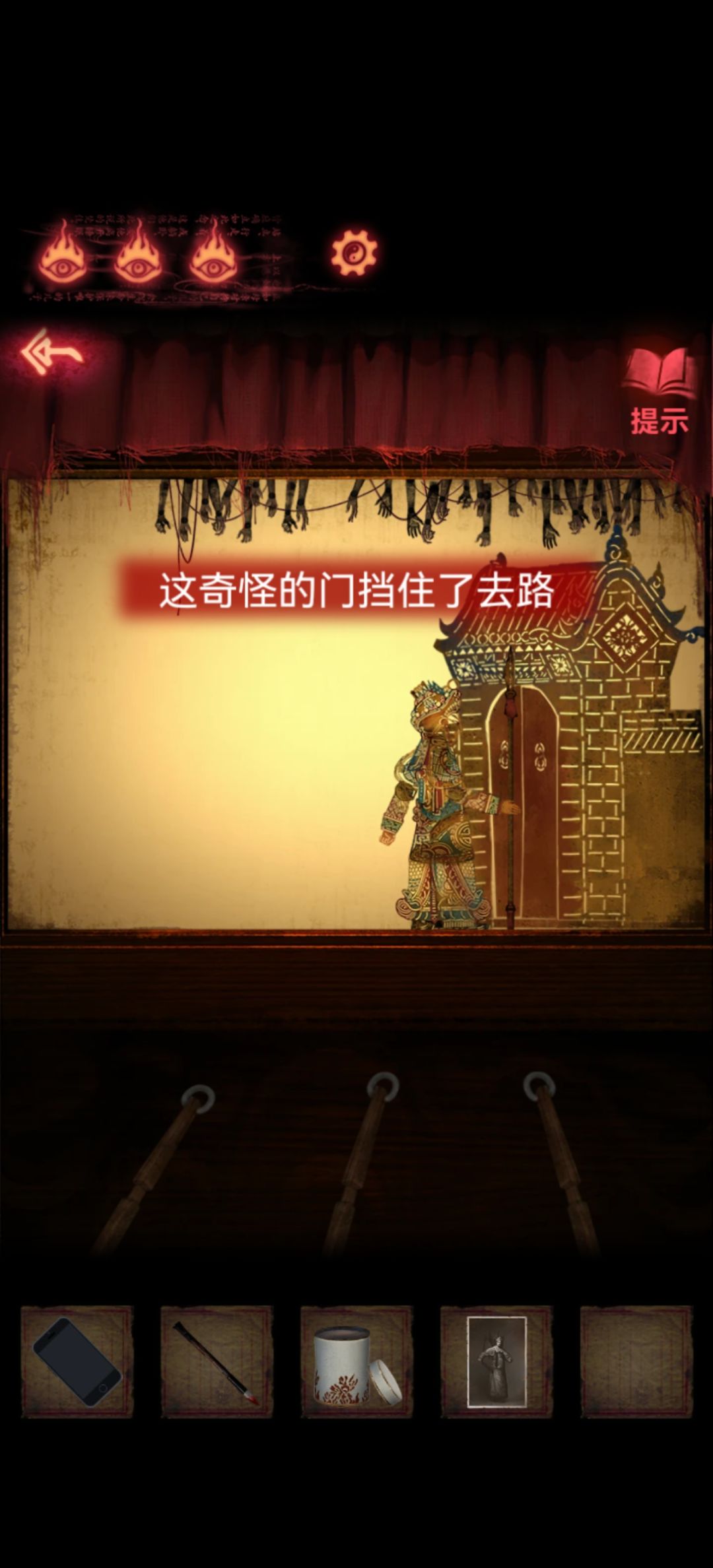 用卸妆水洗掉门上的字,蘸取红色颜料再写个开,不会写也没关系反正点一下就自己写上了,然后皮影中的门也打开了。