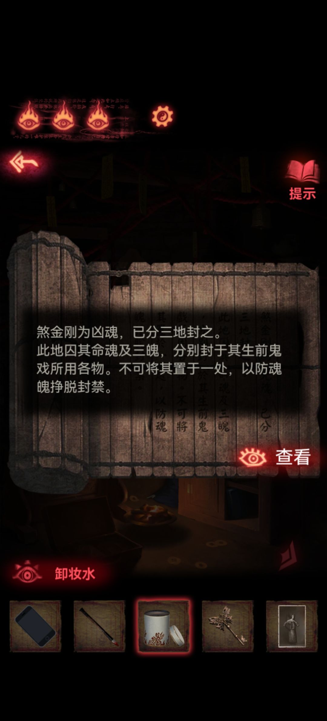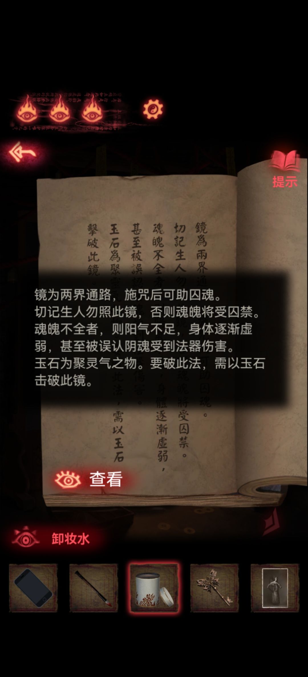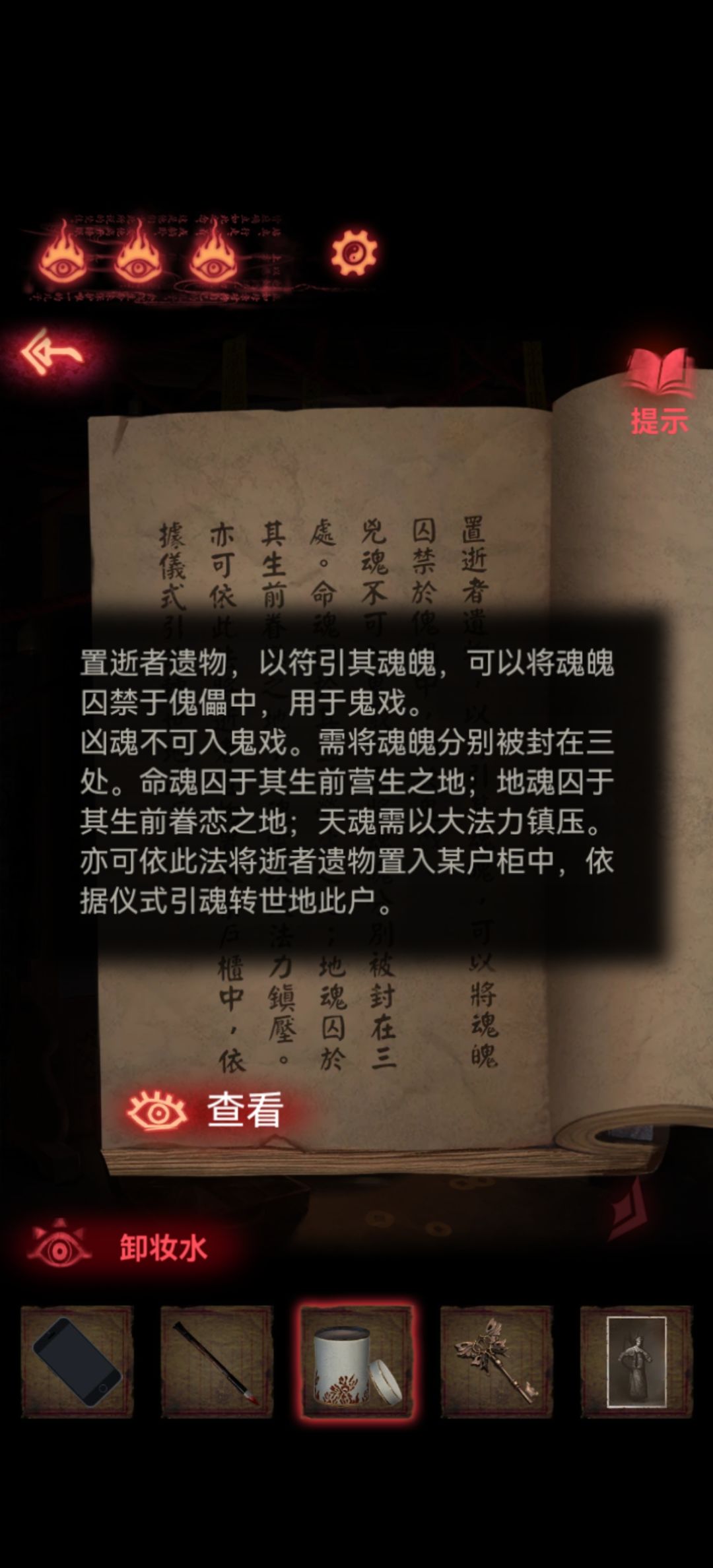 查看第二层书可以得知命魂在生前工作的地方,地魂在生前留恋的地方,天魂被镇压需要把遗物放在某个柜子里。