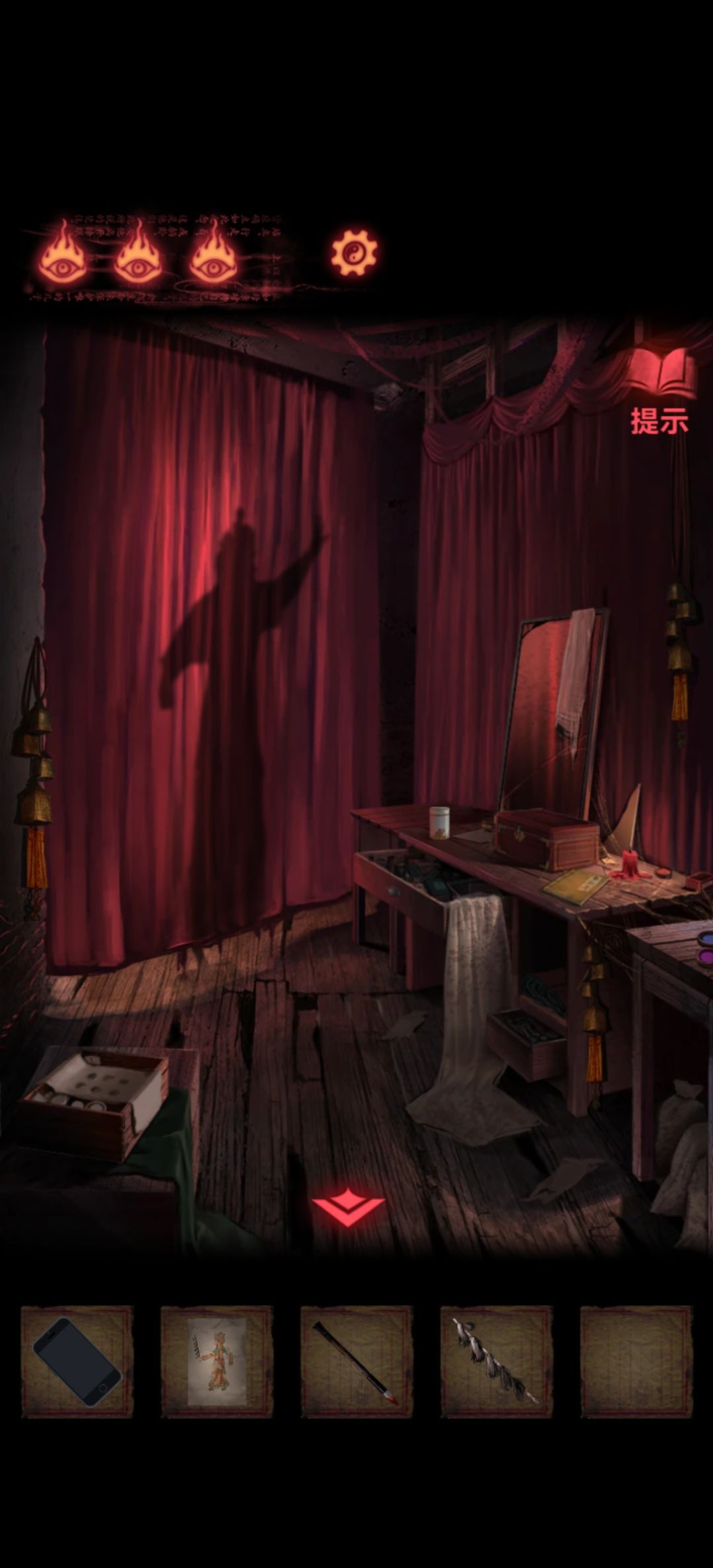 回到镜子房间玉石砸镜子手就都消失了,然后妹子感觉一身轻松,我们就可以按照信件密码去调脸谱场景雕像身后金刚杵的链子长度了,目标自然就是刚刚信件里倒三角的高度了,打开后拿到一双鞋子,这样戏服就全了。