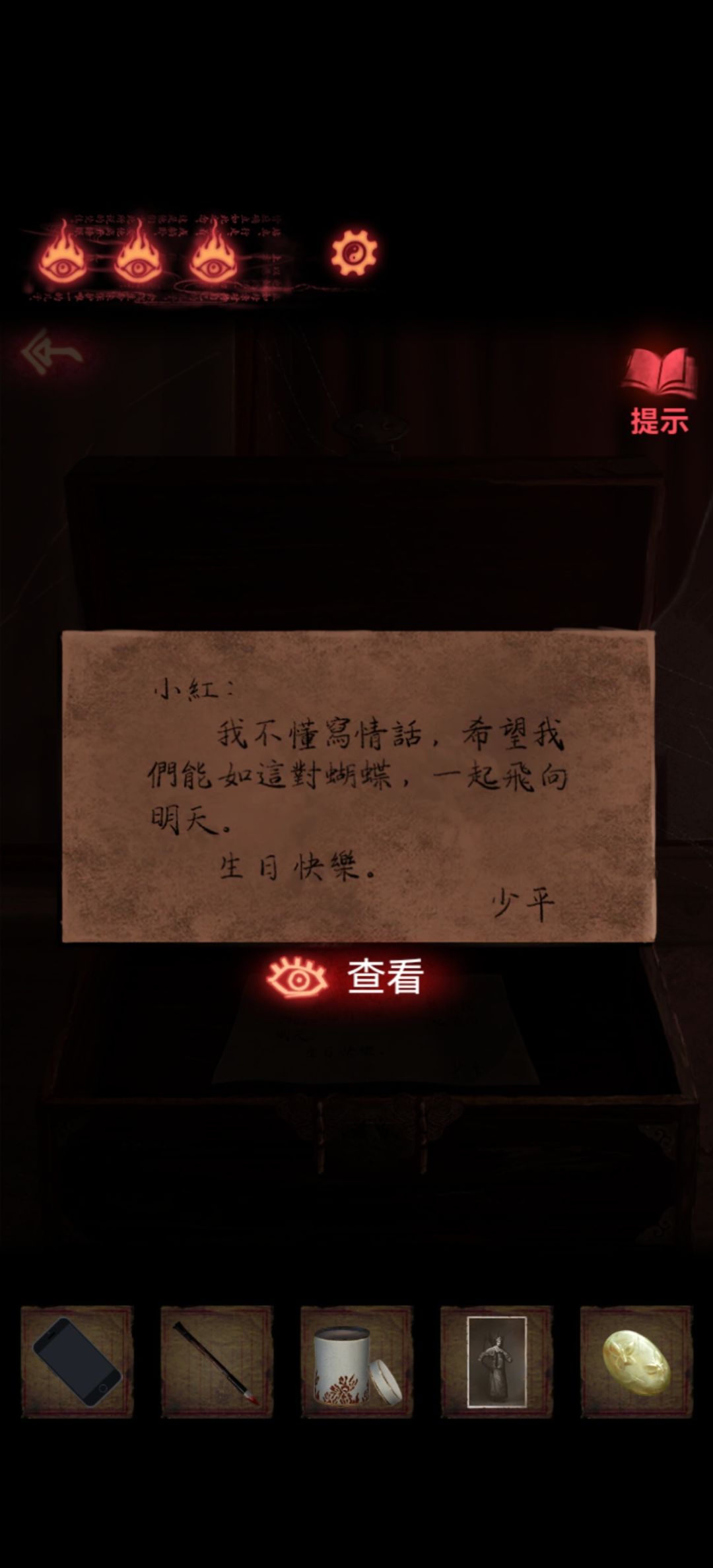 打开箱子可以拿到一把蝴蝶钥匙,还有一张戏装男子照片,还有一封血迹斑斑的信件。