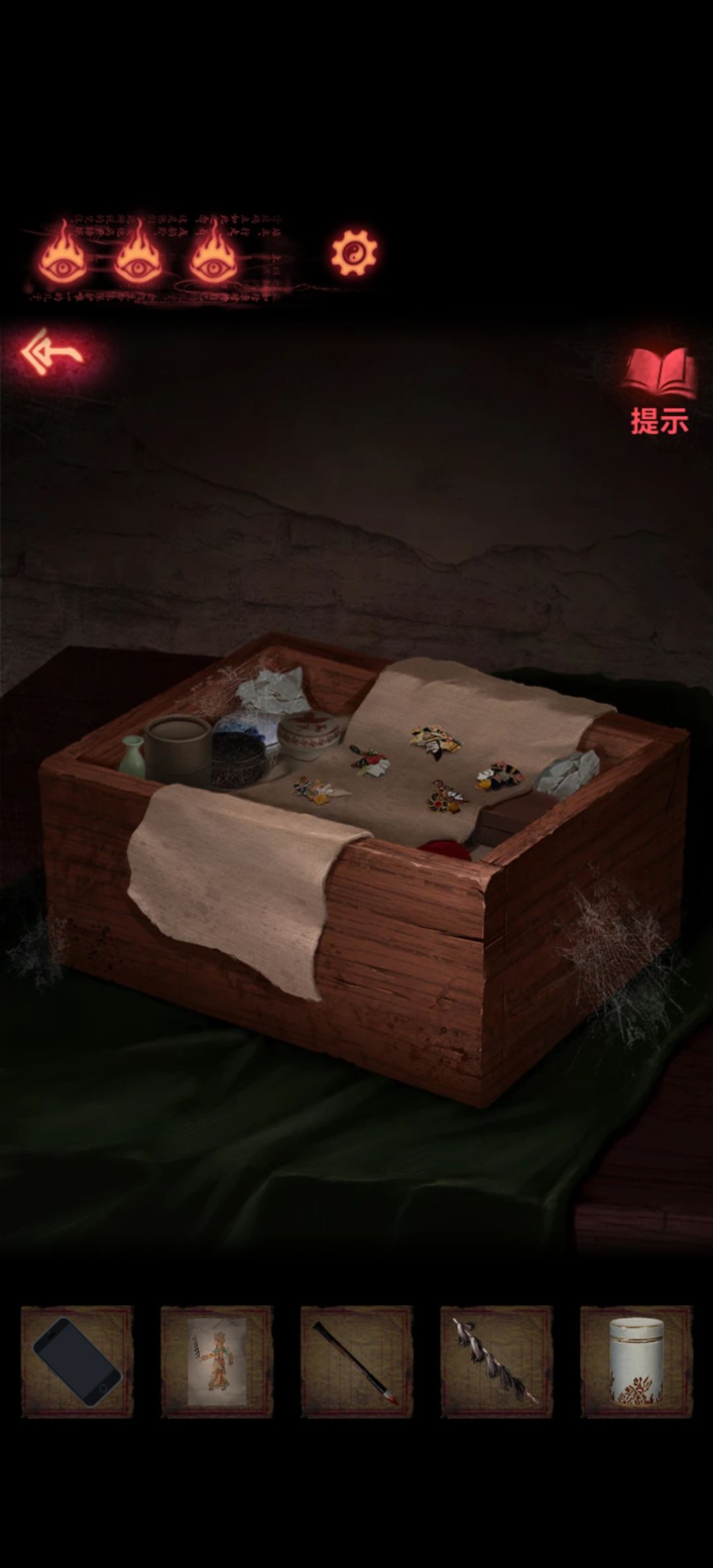 查看左下角箱子,先挪去上面两个物品可以拿到一支眉笔,其实就是毛笔啦,之前的眉笔不像是现在都是硬质的更没有眉粉~