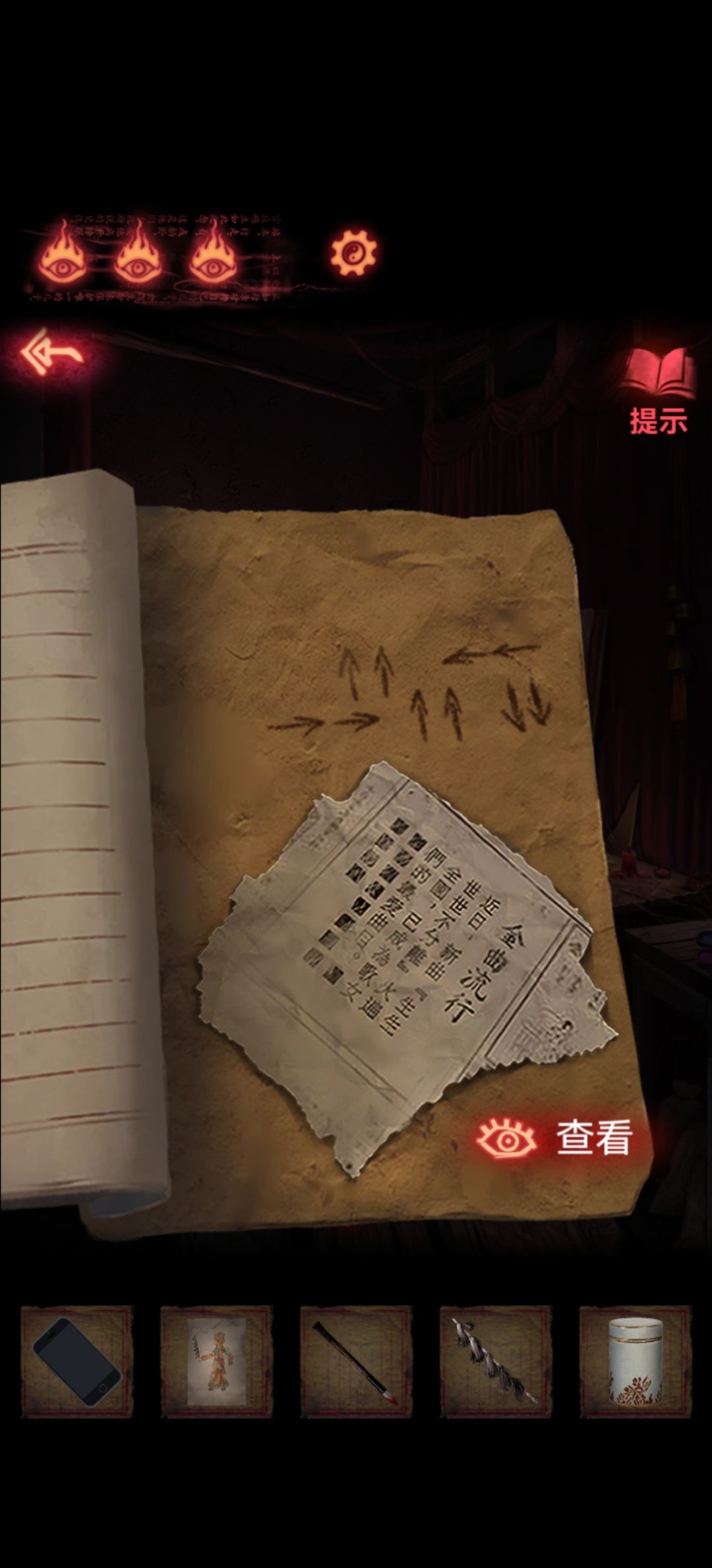 桌子上的书翻到最后看到一张上一章听到的歌曲剪报,上面画了各种箭头,不是让你玩魂斗罗而是刚刚那些脸谱眼睛的提示,记一下↑↑、←←、→→、↑↑、↓↓,竟然没有→←真是太遗憾了呢~