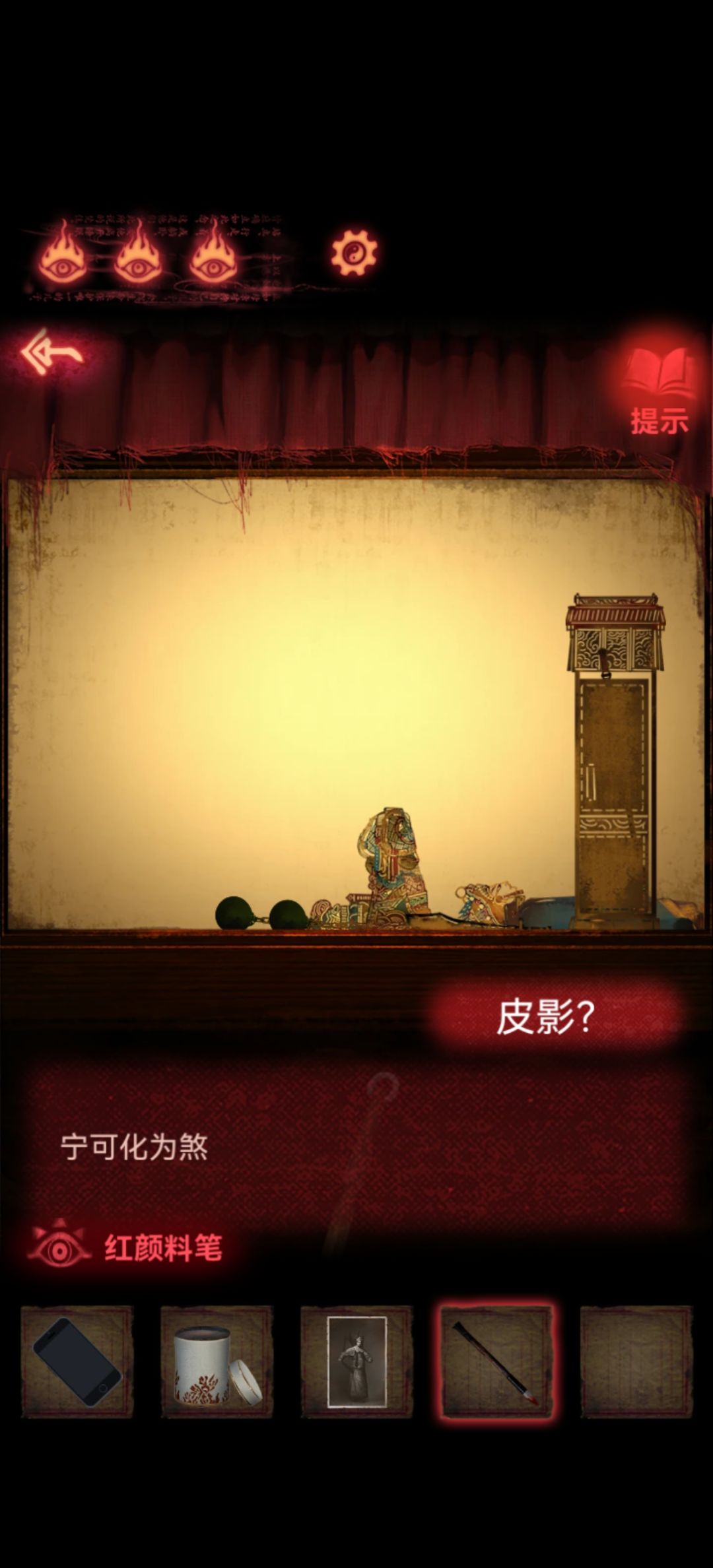 继续控制皮影前行突然就出现了个大门,再次回到脸谱场景看到颜料旁边也出现了这个门,不过既然是颜料写的字那就很好办了。