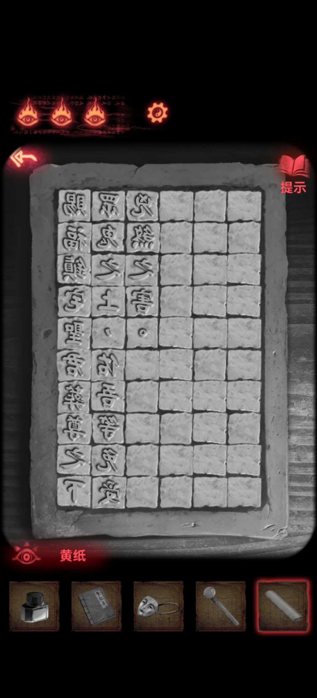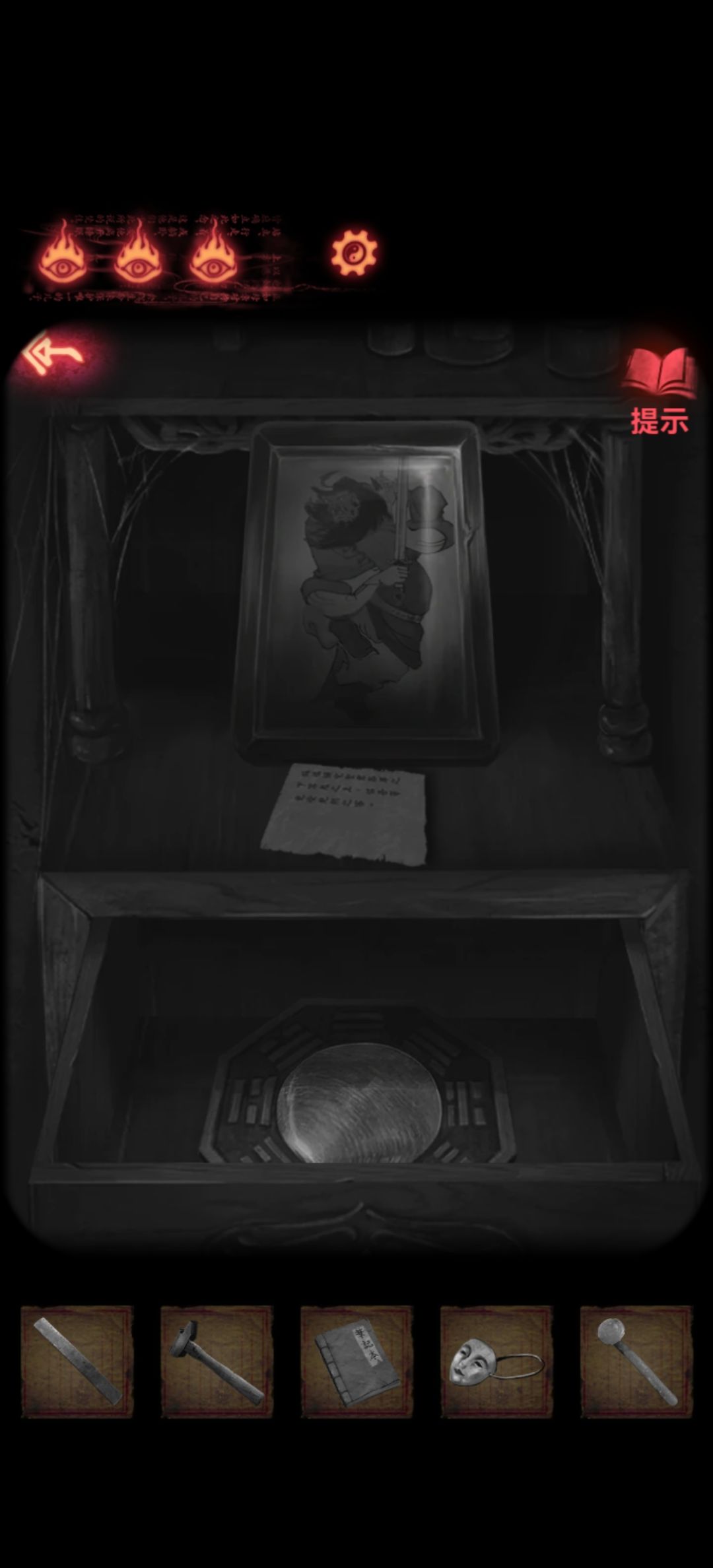 然后泼上墨汁用黄纸拓印下来就能拿到祷文了,回去上面是木偶手臂房间,在钟馗像面前摆上祷文,下面抽屉打开获得八卦镜。