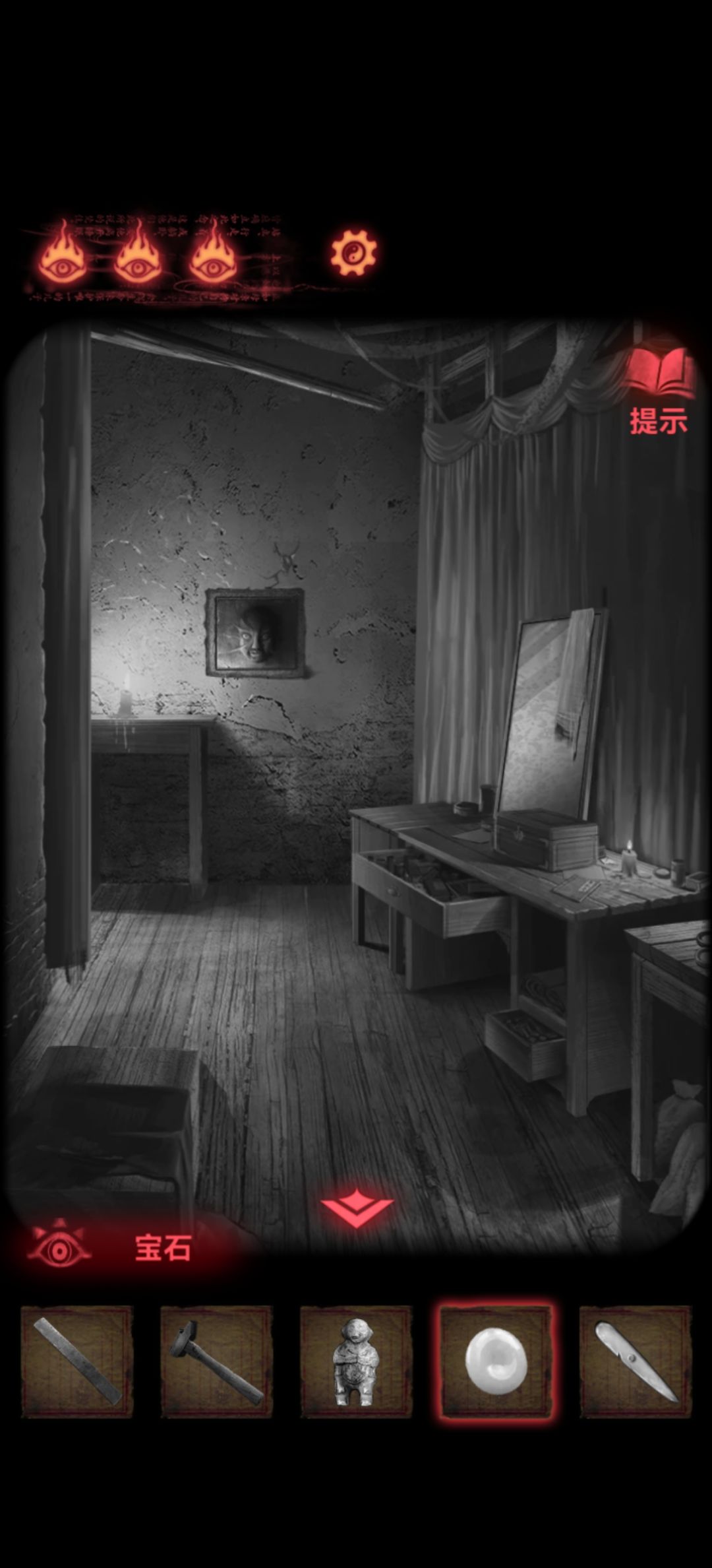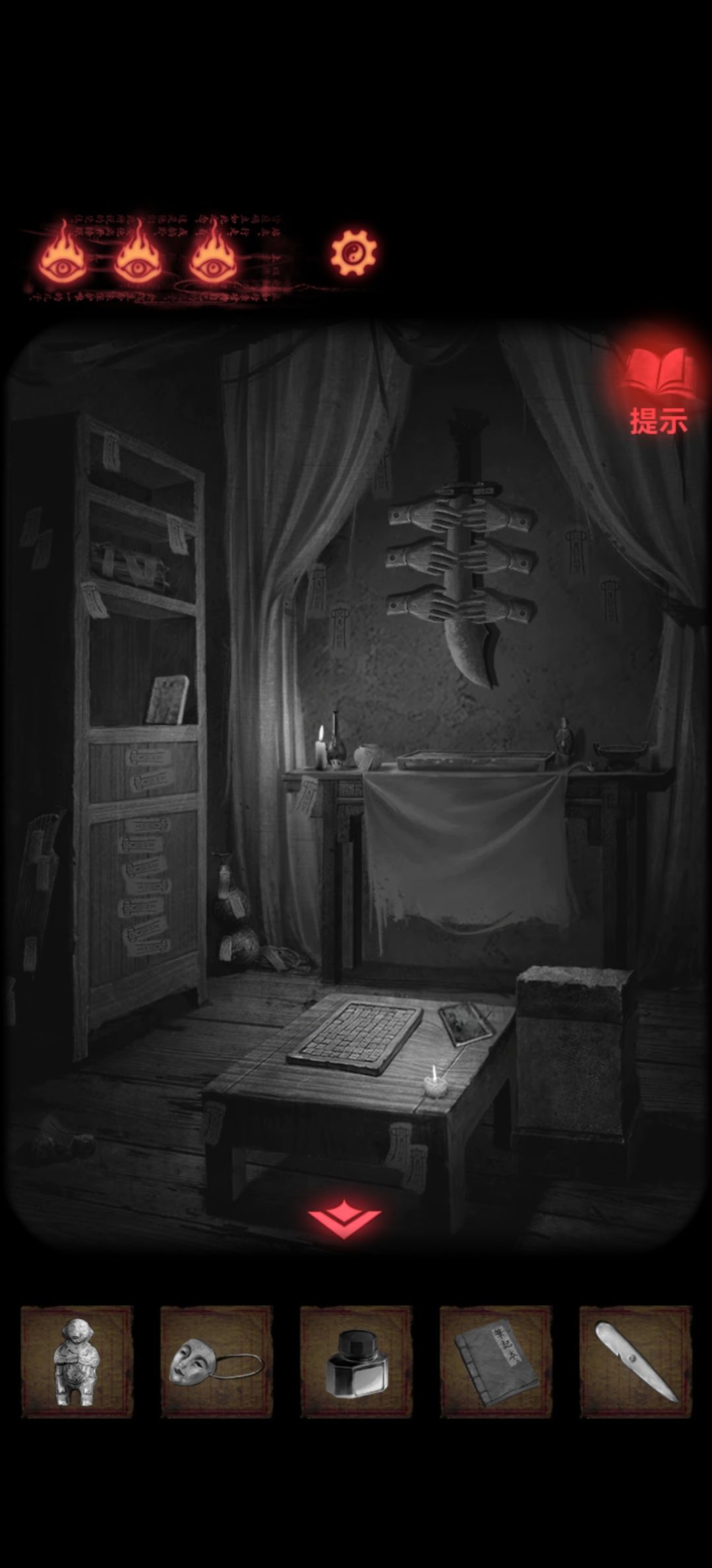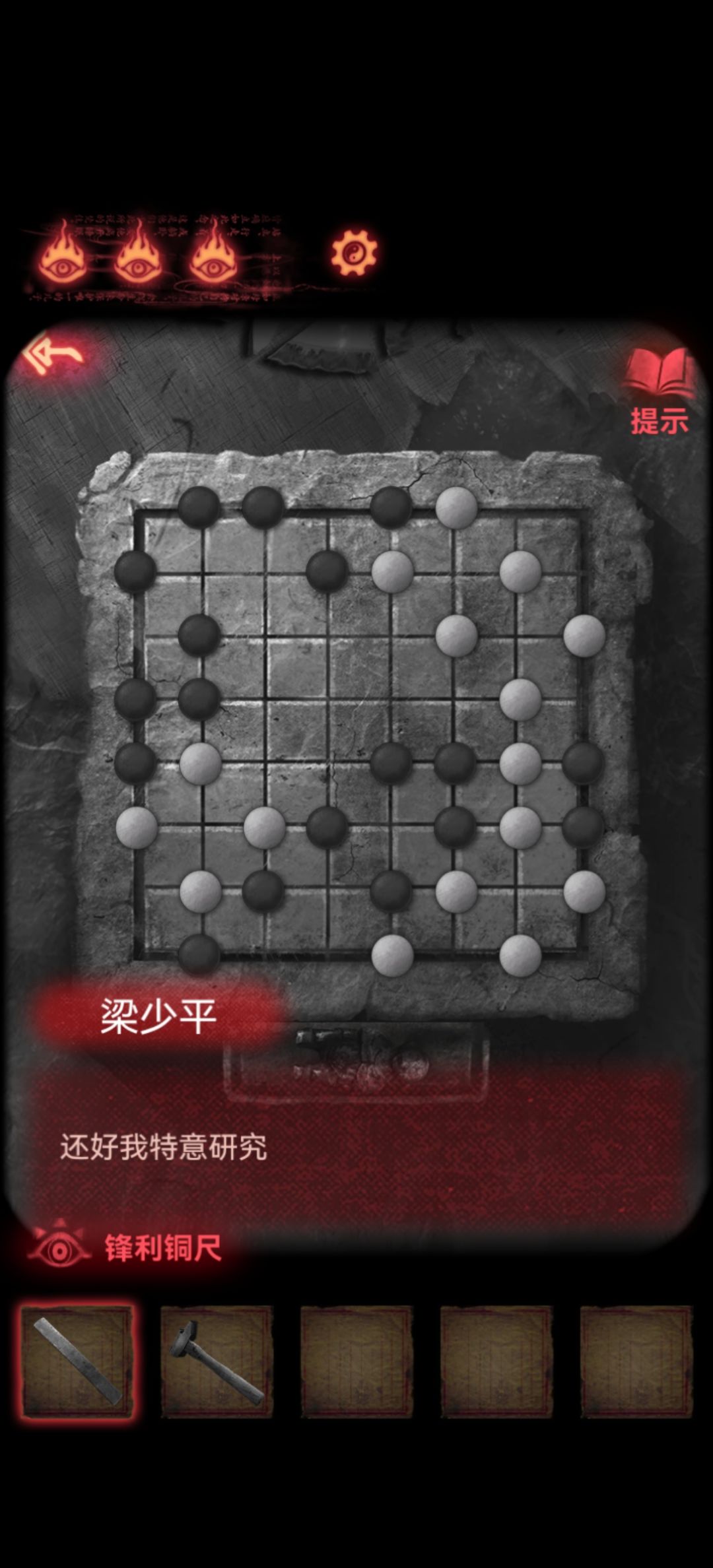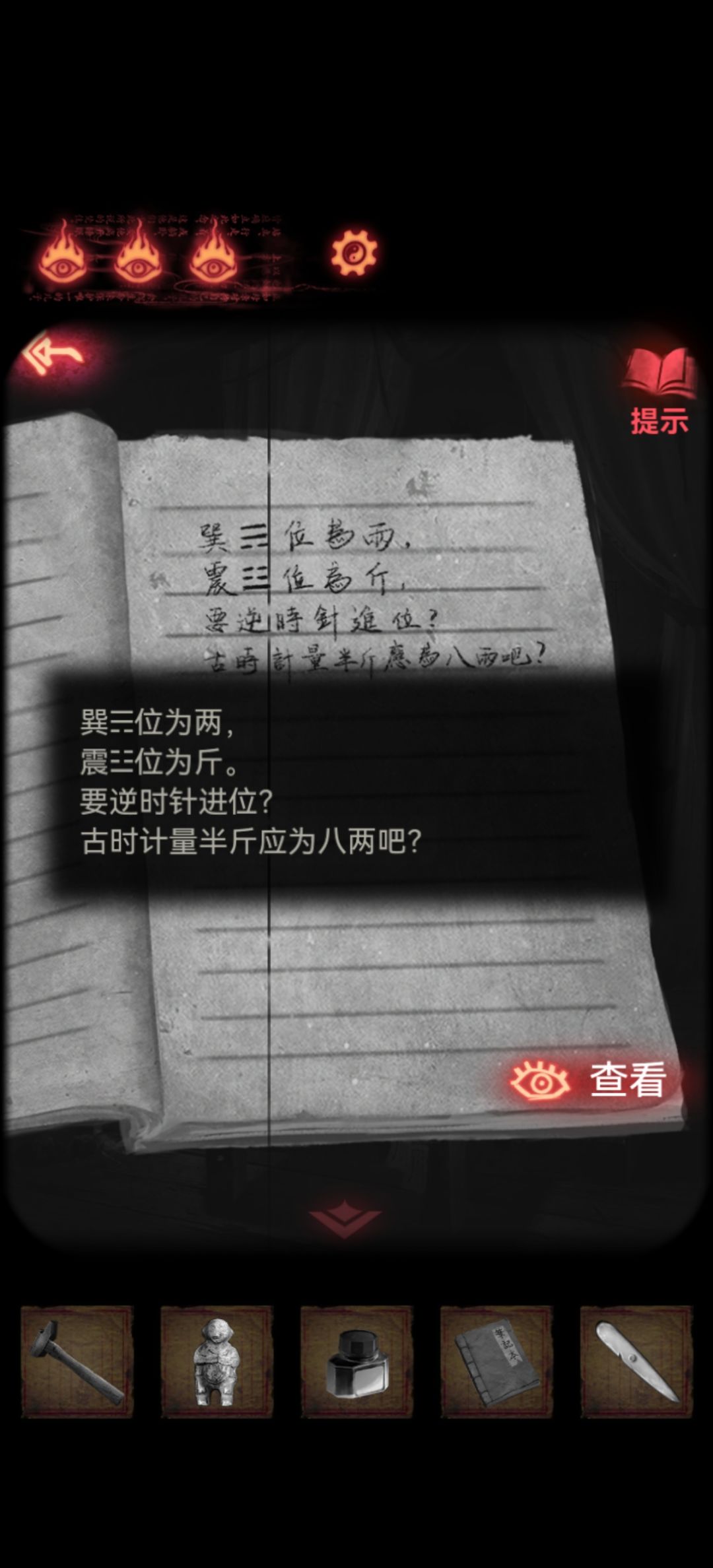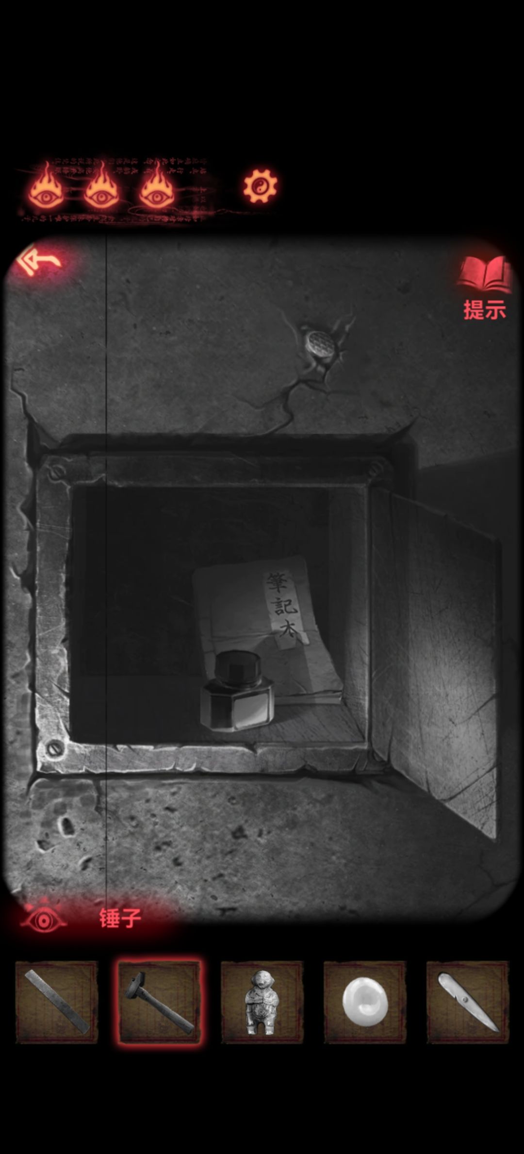 剧情后面对着一个黑白的世界,别担心手机没坏,你看提示还是红的嘛~开局自带铜尺一把,在之前用硬纸板撬墙的地方拿到锤子,左边桌子上八卦算盘暂时没线索不用管。