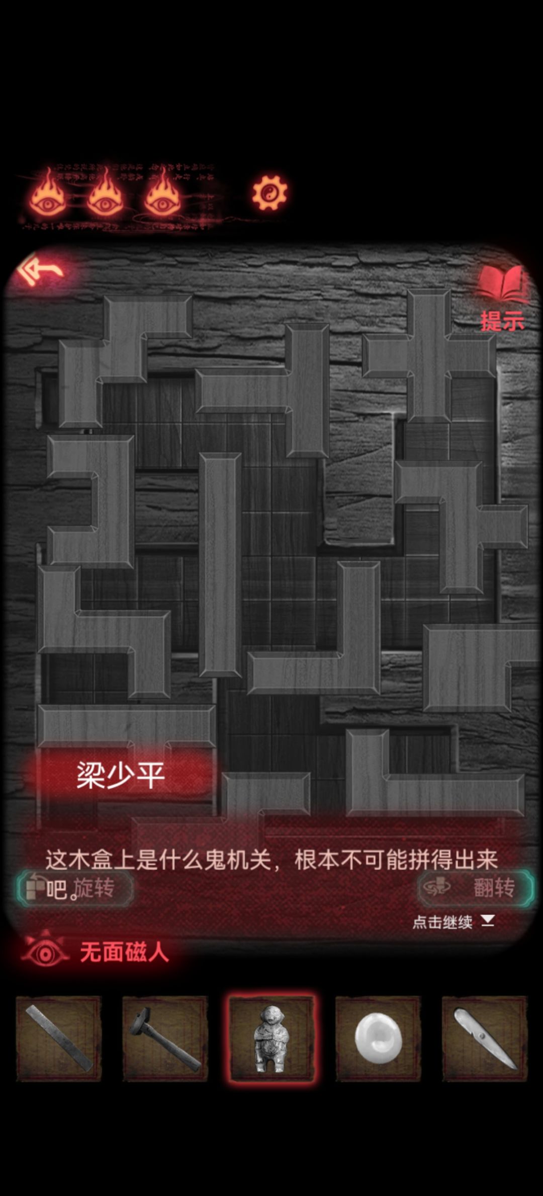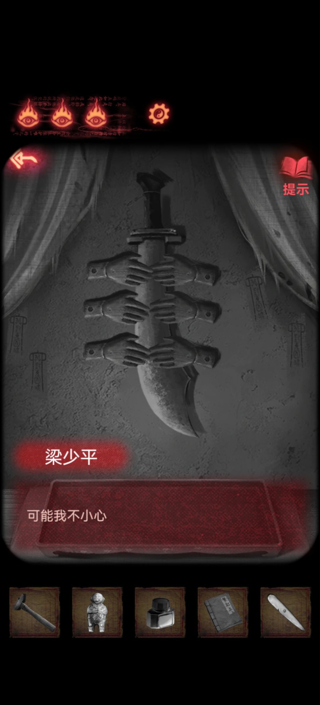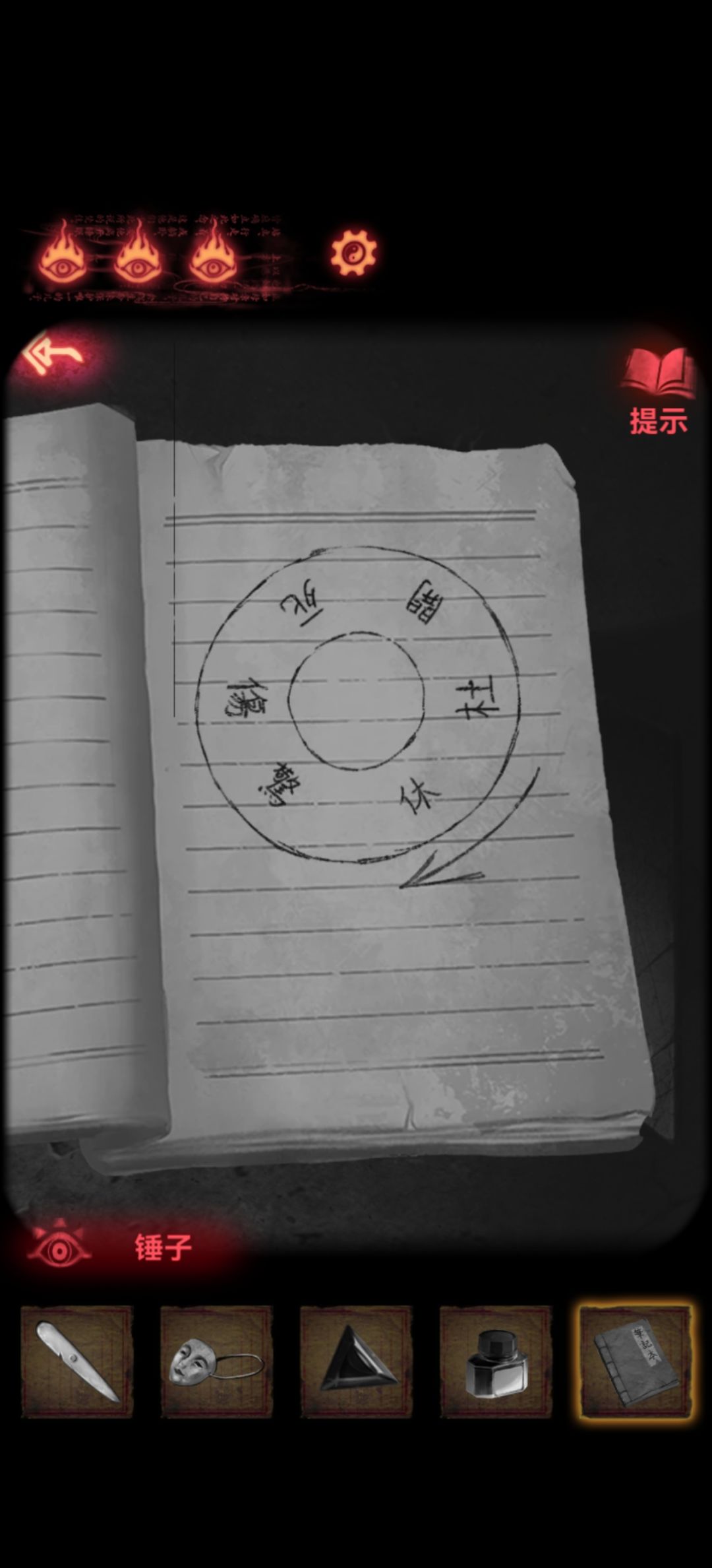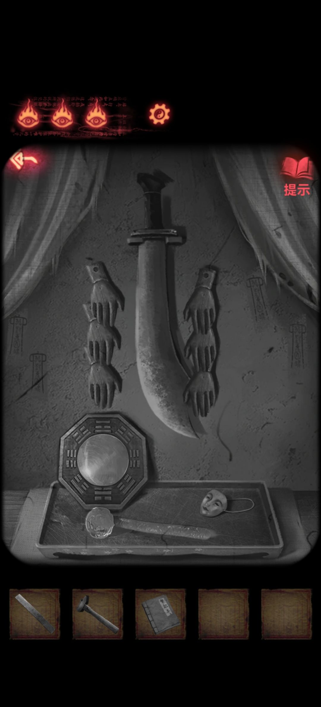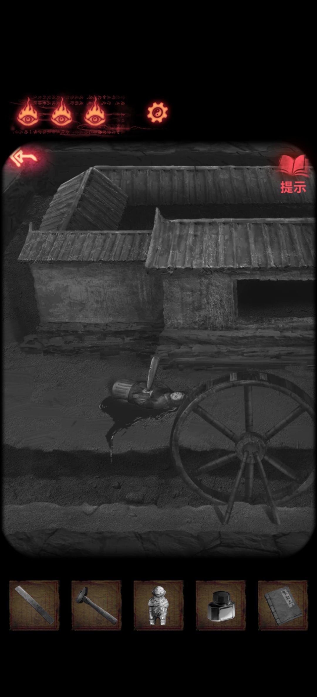 剧情后面对着一个黑白的世界,别担心手机没坏,你看提示还是红的嘛~开局自带铜尺一把,在之前用硬纸板撬墙的地方拿到锤子,左边桌子上八卦算盘暂时没线索不用管。