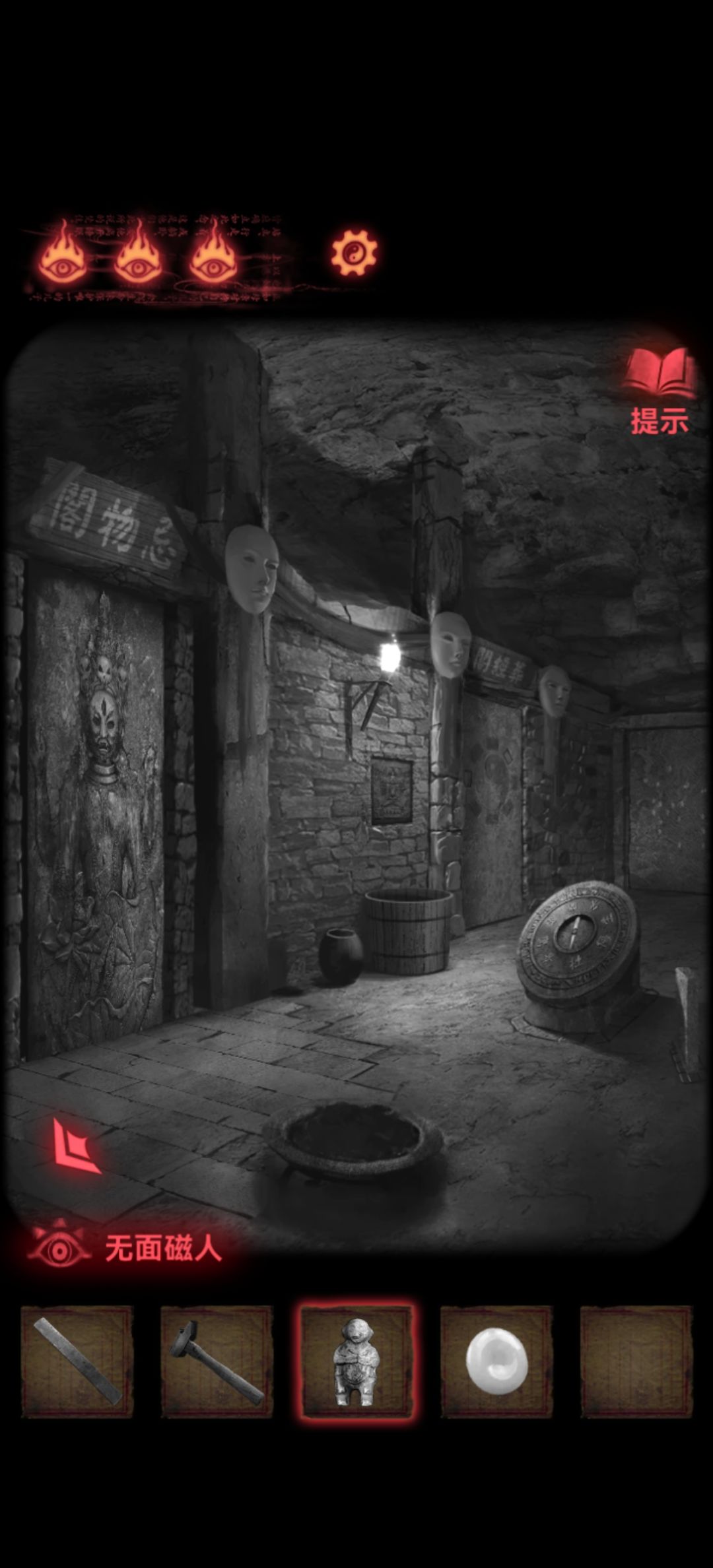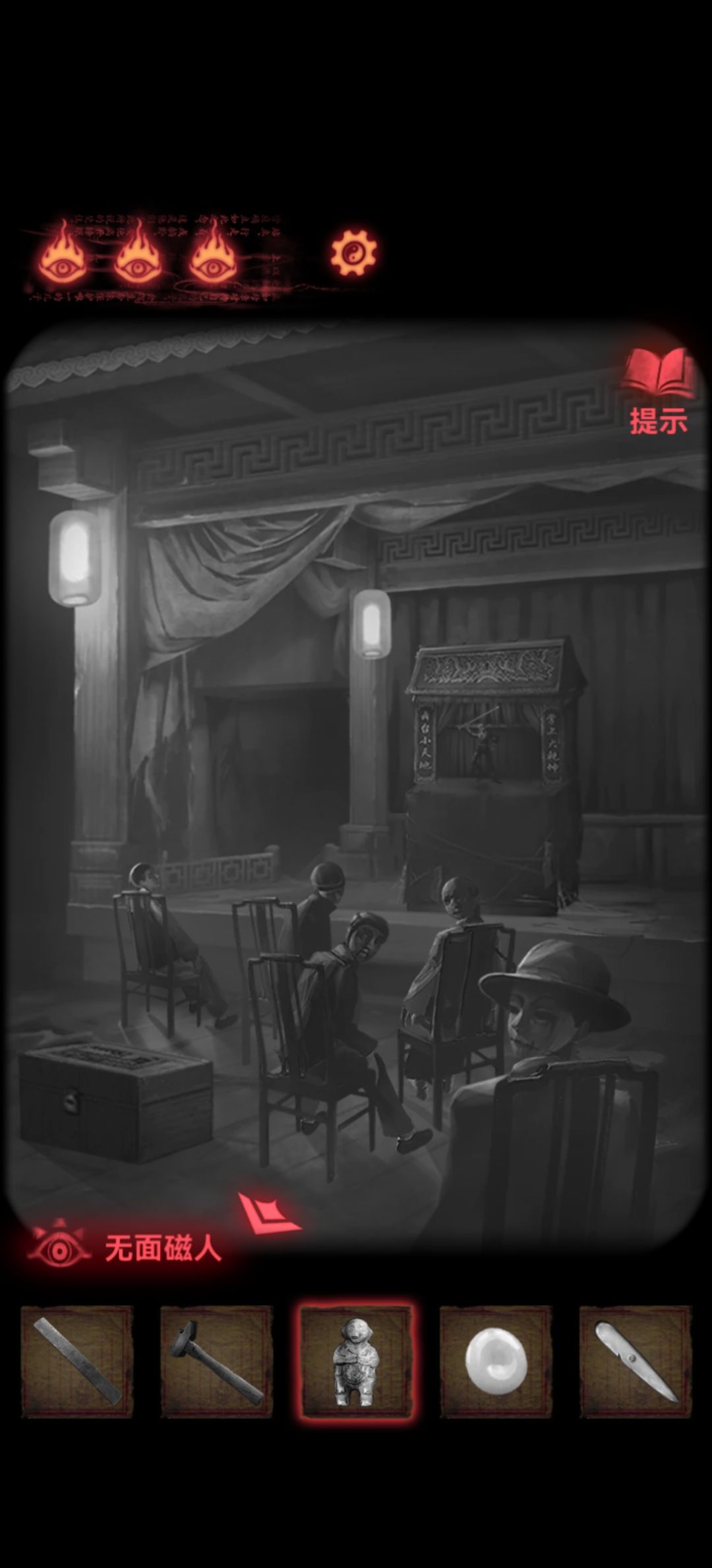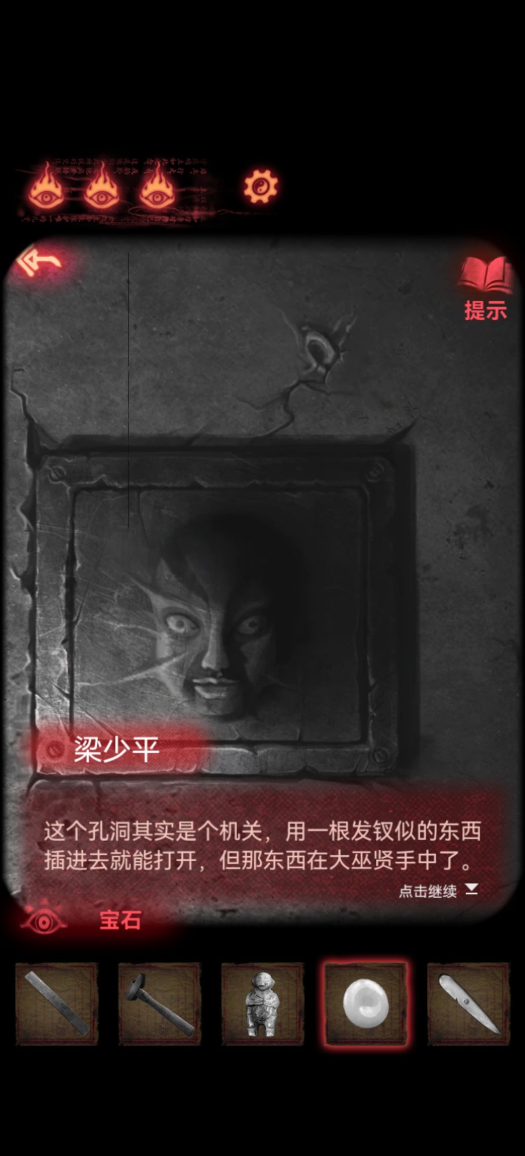 后台墙上原本空白的地方现在有一张人脸,提示用发钗一样的东西插进去就能打开了,不禁想起了刚刚小木偶手上的钉子,一会就不能让小木偶继续嚣张了。