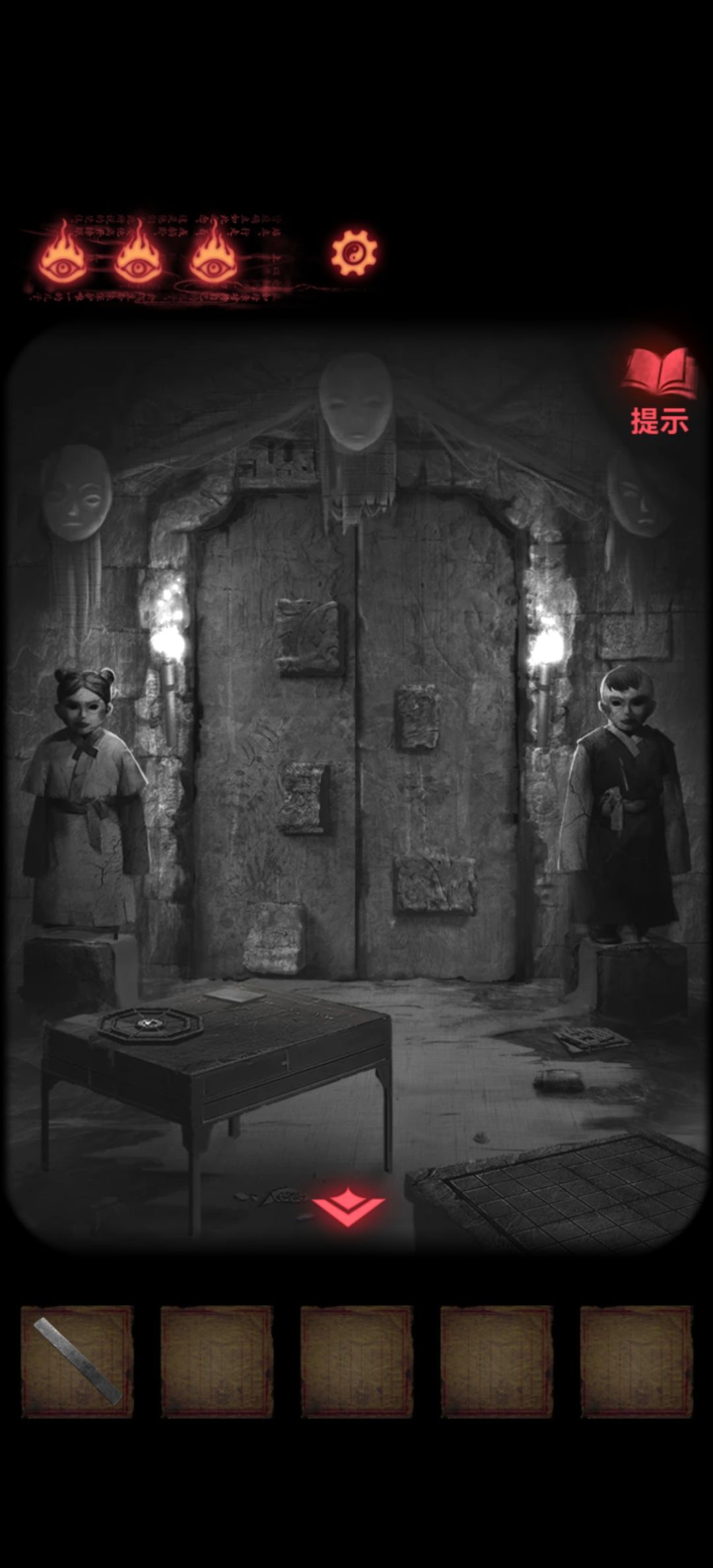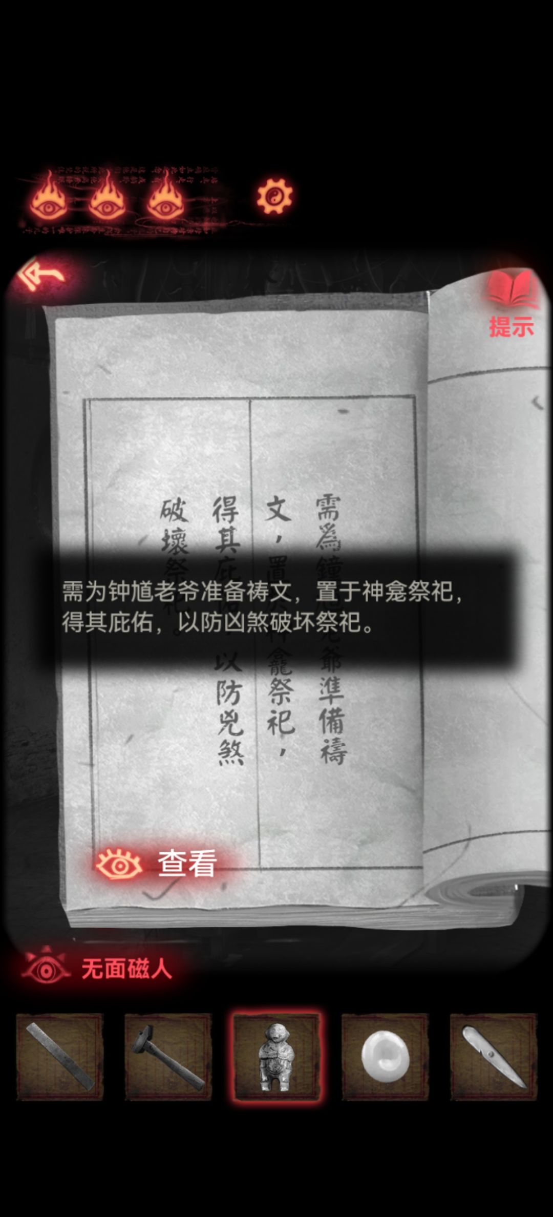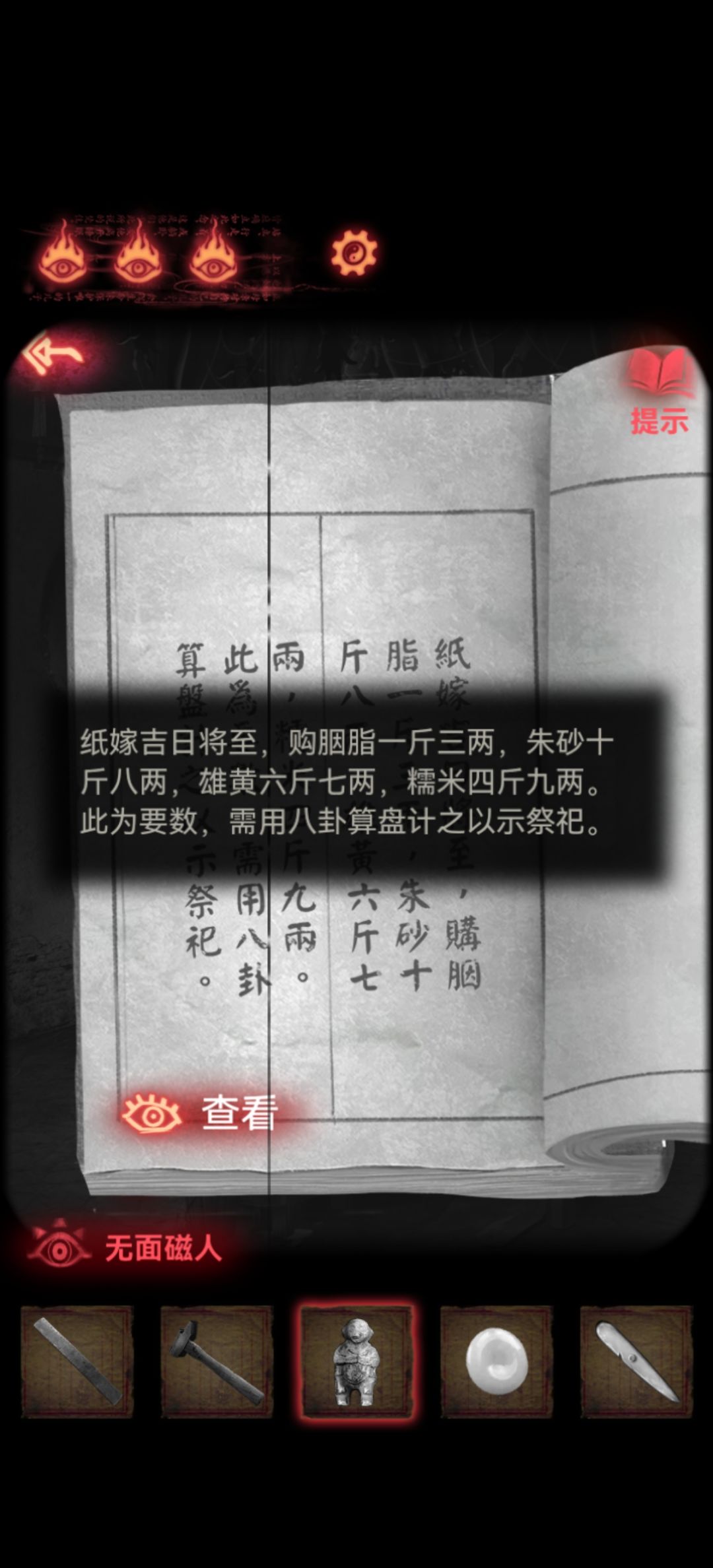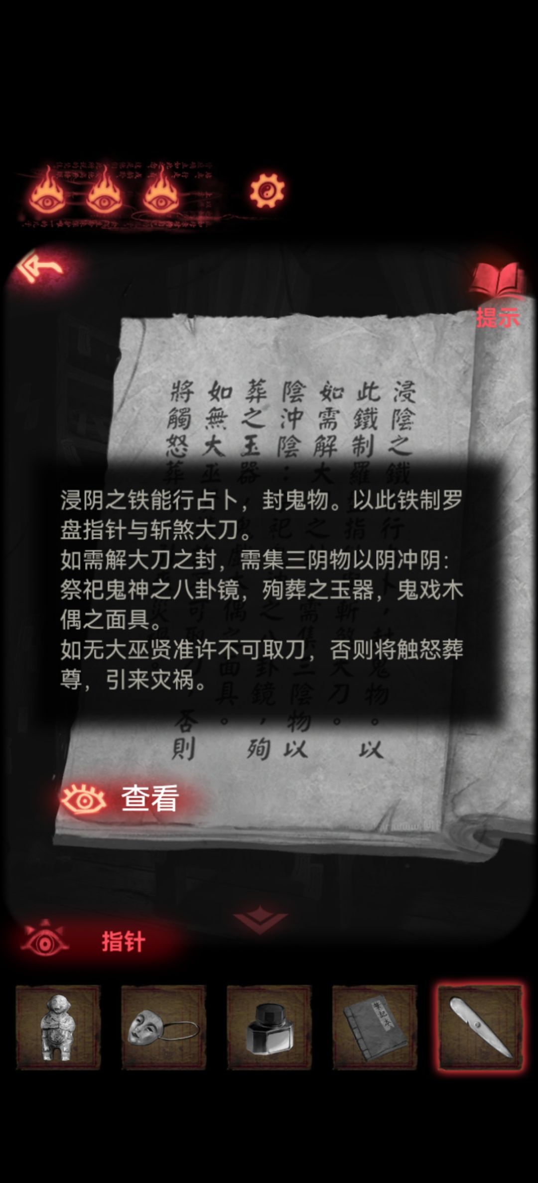 旁边有本仪式书,第三页重点铁制指针和斩煞刀可以封鬼,大刀解封需要八卦镜+玉器+小面具。