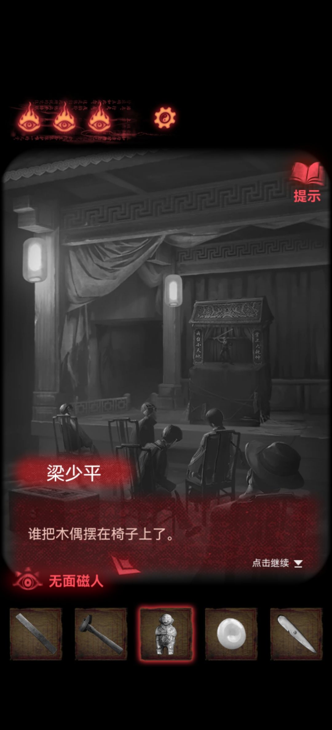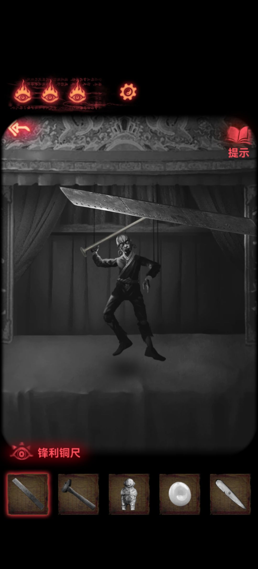 果断回来找小木偶,一尺子割断它的提线,然后就可以顺利拿走钉子了,然而刚拿走退出来小戏台就突然塌了,后面露出了一个手提长刀的大木偶,这次就不能尺子割线了。