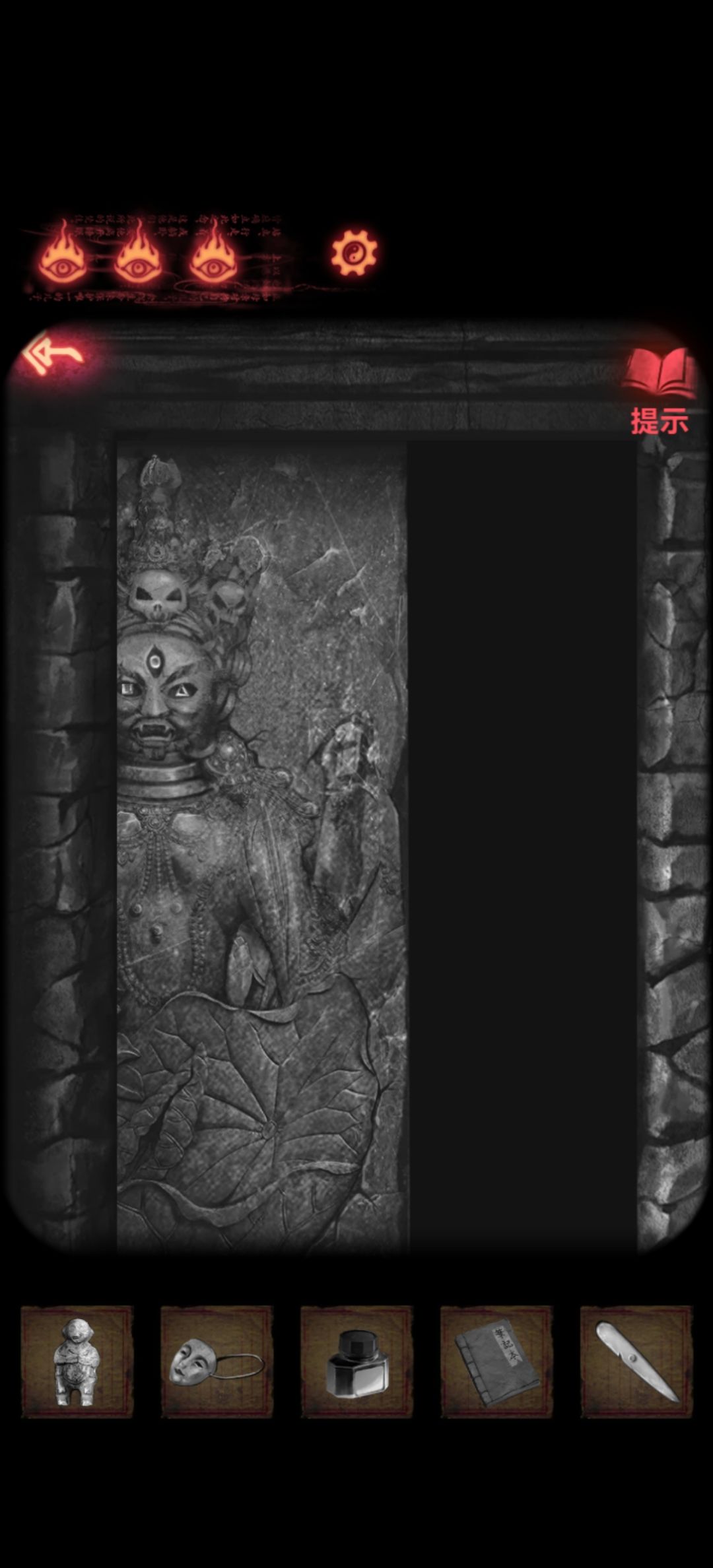 继续往右走看到了完整的忌物阁,查看一下就看到三眼葬尊每个眼睛都是个凹槽,妥了我们需要找三个宝石。