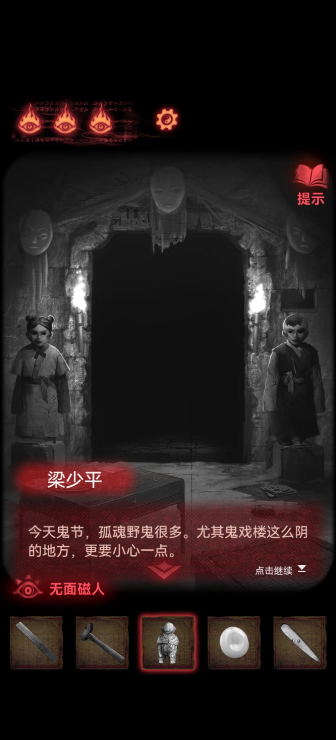 来到鬼戏楼也不一样了,桌子上没有了颜料等,左边柜子拿到一个小面具,这里点右边柜子可以看到个钟馗画像,据说村人祭祀极为随意还弄什么哪吒三太子66666666