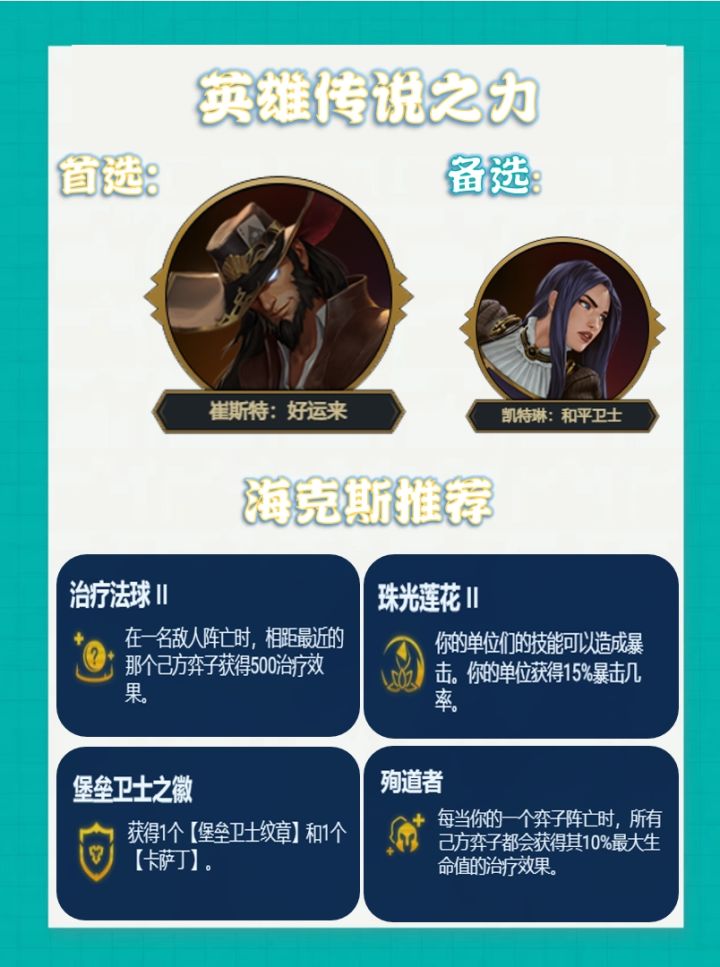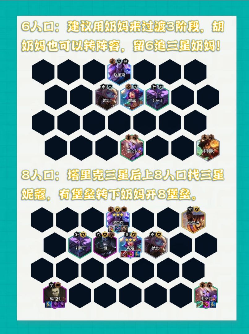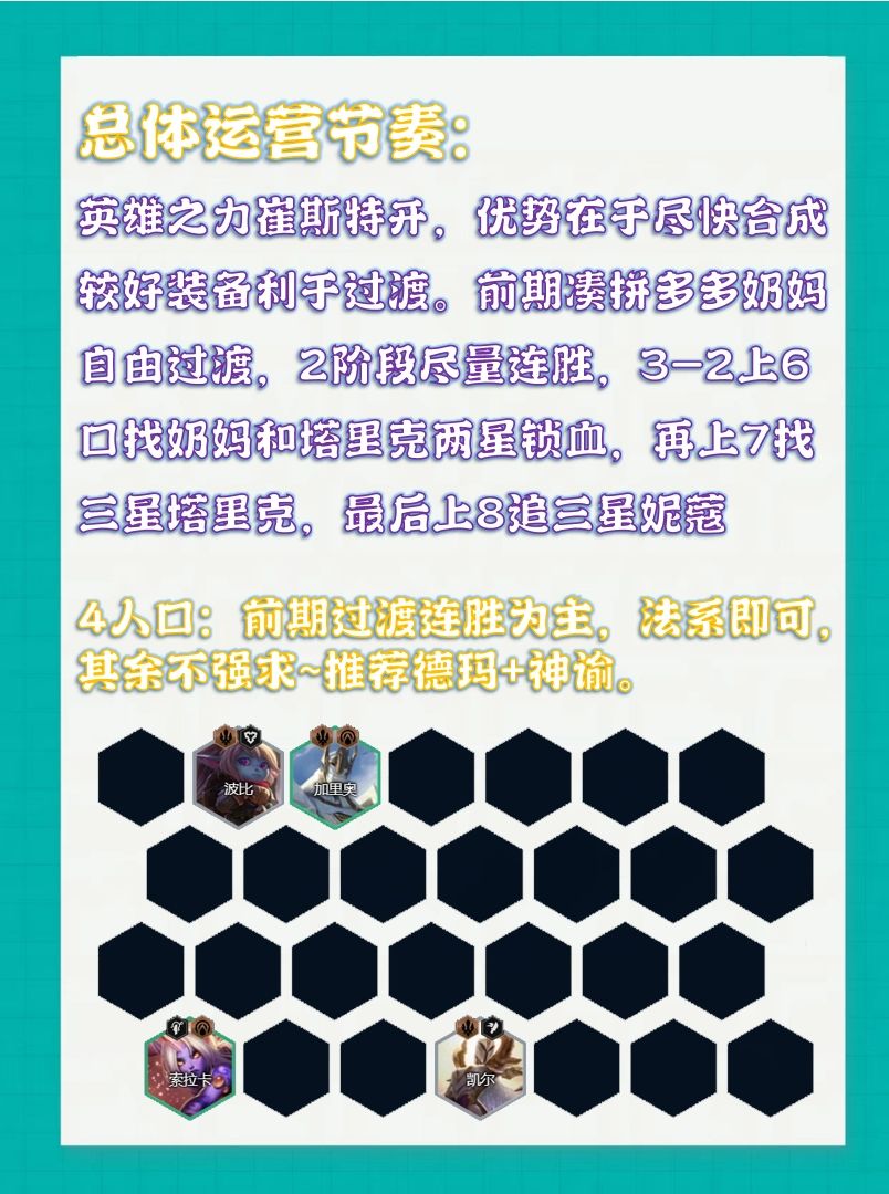 节奏:英雄之力崔斯特开,优势在于合出完美装备,过渡顺利,前面拼多多奶妈过渡,2阶段走连胜。3-2上6人口找核心牌两星,7口追三星塔里克,8口追妮蔻三星。