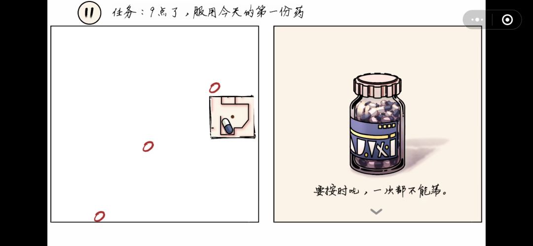 得知时间是早上9:00后,我们就该服药了。此时左边的屏幕中会出现几个红圈,那是承载着“我”的记忆的物件所在的位置。其中一个圈正是我们要找到的药,还是和前面一样,穿过迷宫,到达药丸标记所在的位置,点击屏幕右边对应的药瓶即可服药。