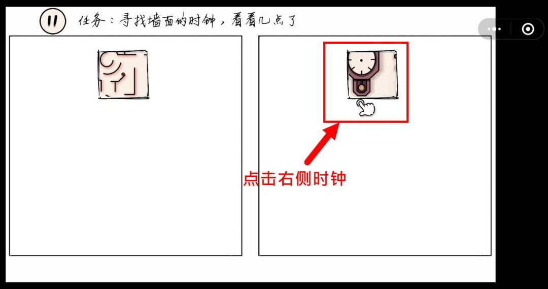 起床之后,根据任务提示需要找到墙面的时钟。这里我们会发现右边的视野变小了,这是为了模拟受到阿尔茨海默病影响下患者的视角,与前面提到的阿尔茨海默病的病症相呼应。这里我们在迷宫中前进时,需要同时留意右边视野中是否会出现类似“时钟”一样的道具,在它出现在我们的视野中时,点击屏幕右侧的时钟,就可以“查看时间”了