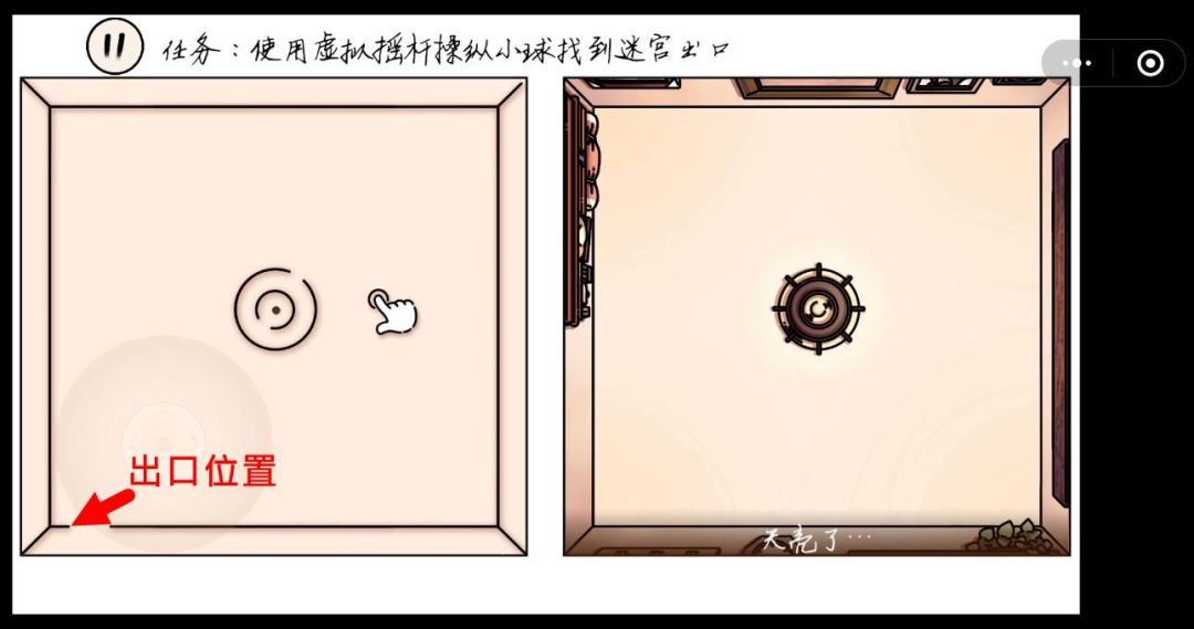 左侧是由线条组成的迷宫,展示的是患者的日常视角;右侧是正常人视角,也是主角身处的现实世界。我们需要完成屏幕上方的任务提示,才能进入下一章节。细心的伙伴会发现迷宫左下角有个缺口,通过虚拟摇杆,控制小球移动到左下角,即可通过关卡,完成“起床”操作。