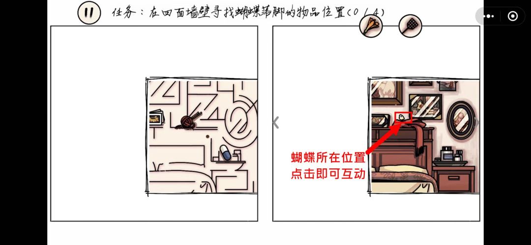 随着进度的推进,在服下第二次药之后,我们的视野会变得更大。在找完全部16个物品之后,我们会需要寻找一些承载着“特别的回忆”的道具,蝴蝶会落在这些道具旁边,找到之后,将右边屏幕的花拖拽到物品上面,就可以让“我”回想起这些物品承载的回忆了。至于是具体是什么回忆,这里小编就不剧透啦。
